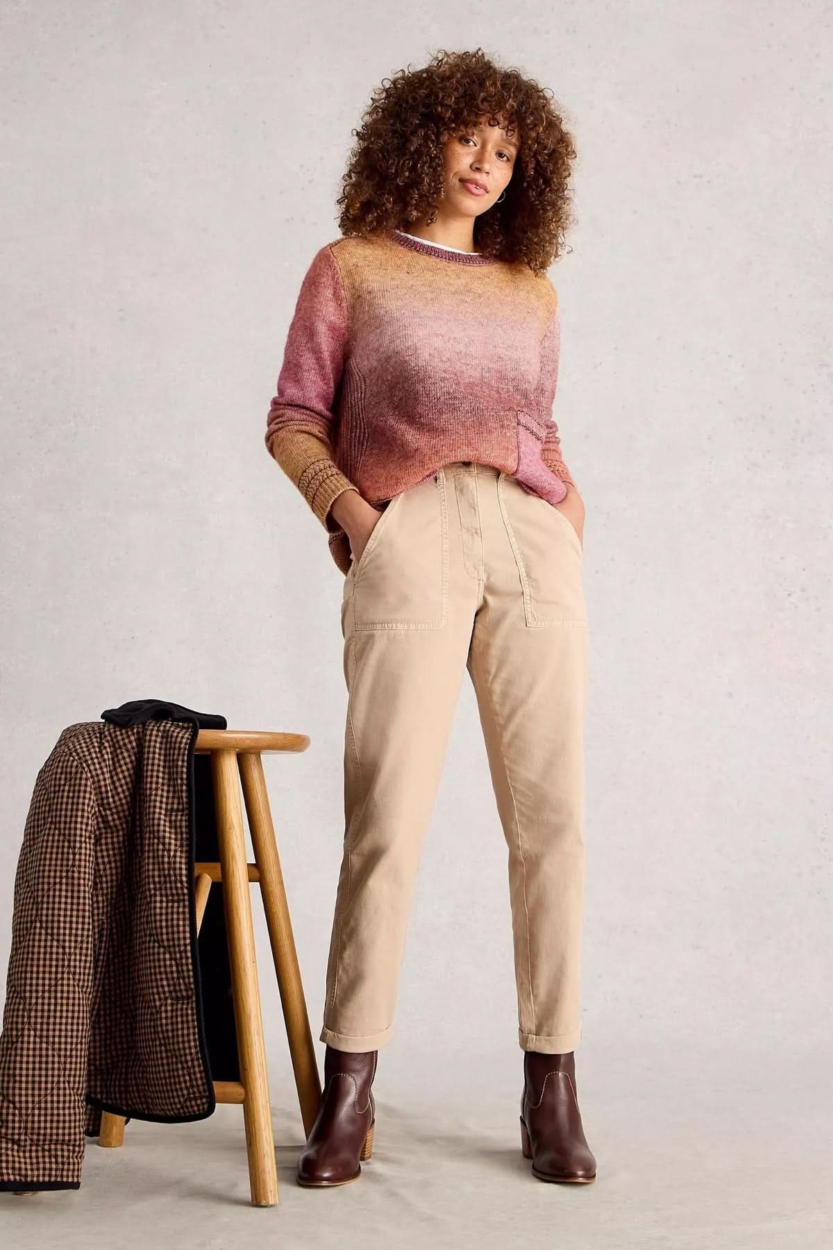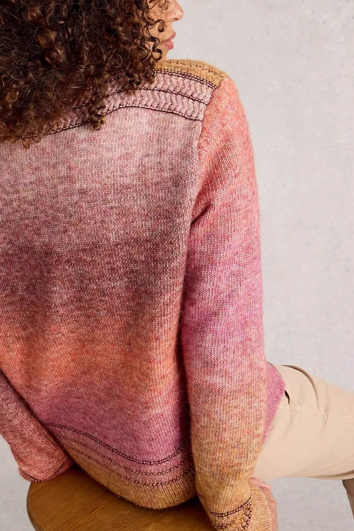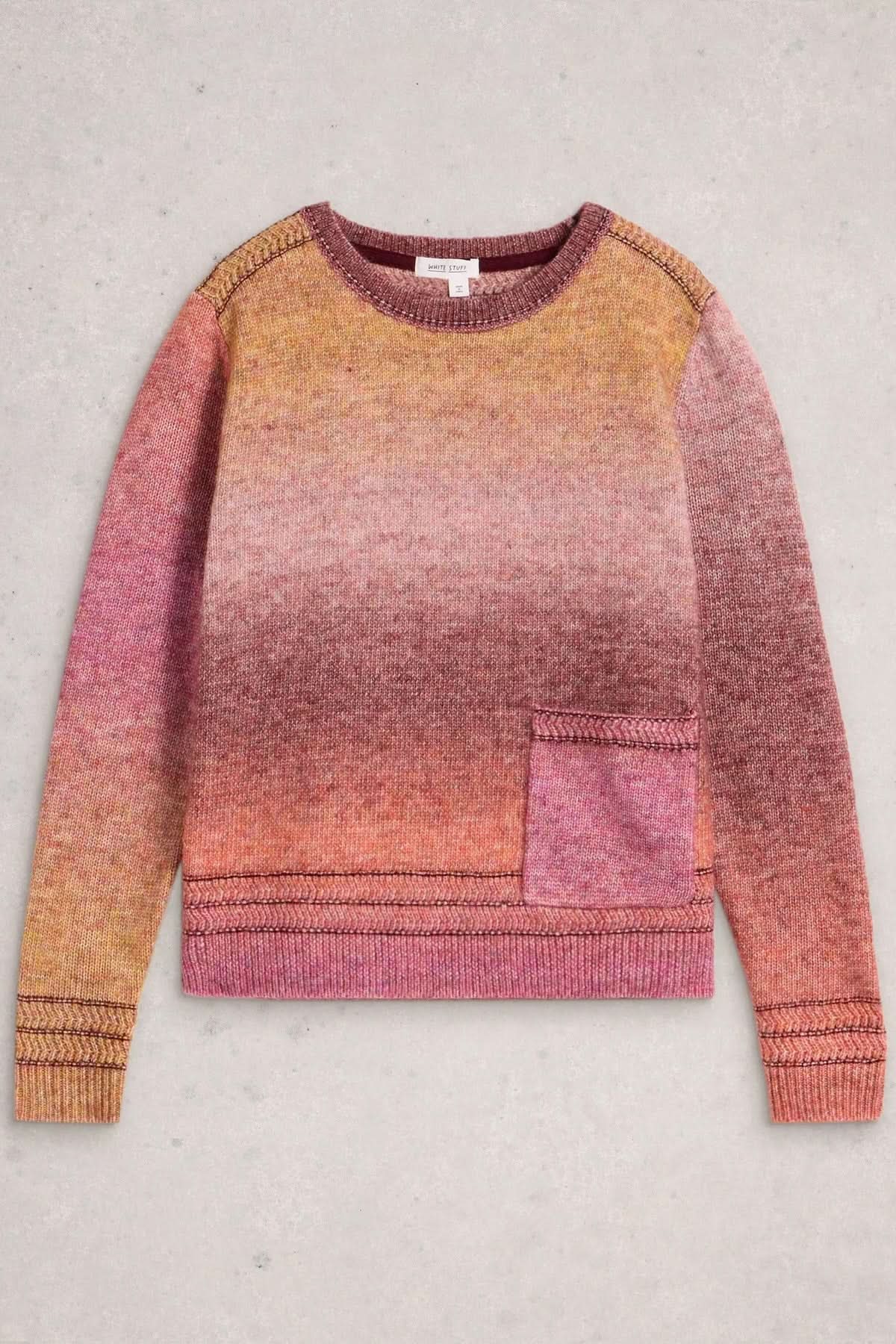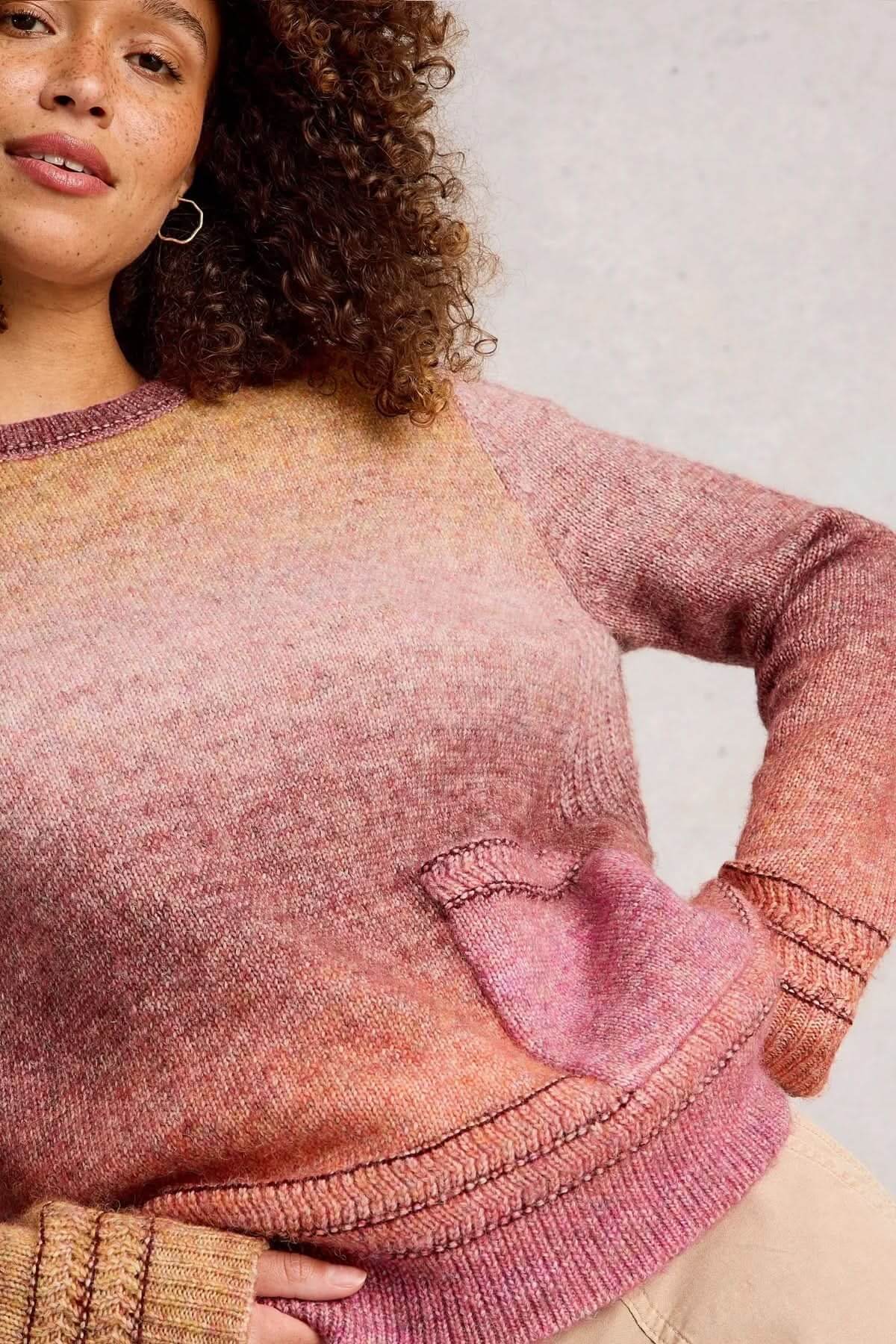 Description: Ce chandail en maille dégradée séduit par ses nuances chaudes qui se fondent harmonieusement pour un effet moderne et unique. Sa coupe décontractée et sa poche kangourou à l’avant apportent confort et praticité au quotidien. Conseil style : associez-le à un jean ou un pantalon clair pour mettre en valeur son dégradé lumineux.