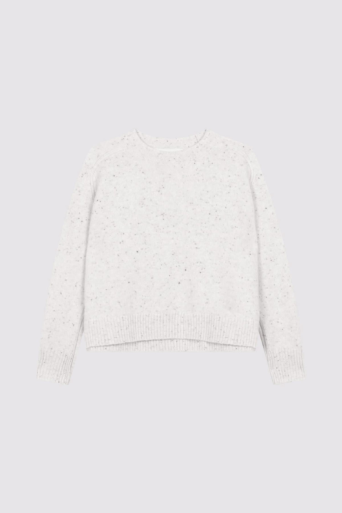 Description : Ce chandail 100 % cachemire allie douceur absolue et allure décontractée. Son tricot délicatement moucheté lui confère une touche texturée subtile, parfaite pour réchauffer vos tenues avec élégance. Sa coupe légèrement ample et son col rond classique en font une pièce facile à porter au quotidien. Conseil style : agencez-le avec un jean délavé pour un contraste de textures tout en équilibre.