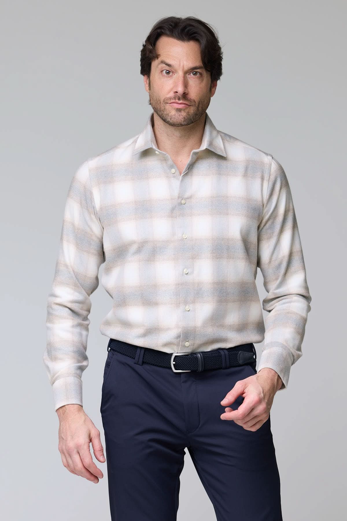 Description : Chemise en flanelle légère au motif à carreaux subtil, alliant confort et élégance décontractée. Sa texture brossée procure une sensation de douceur, idéale pour les journées fraîches ou superposée sous un veston.