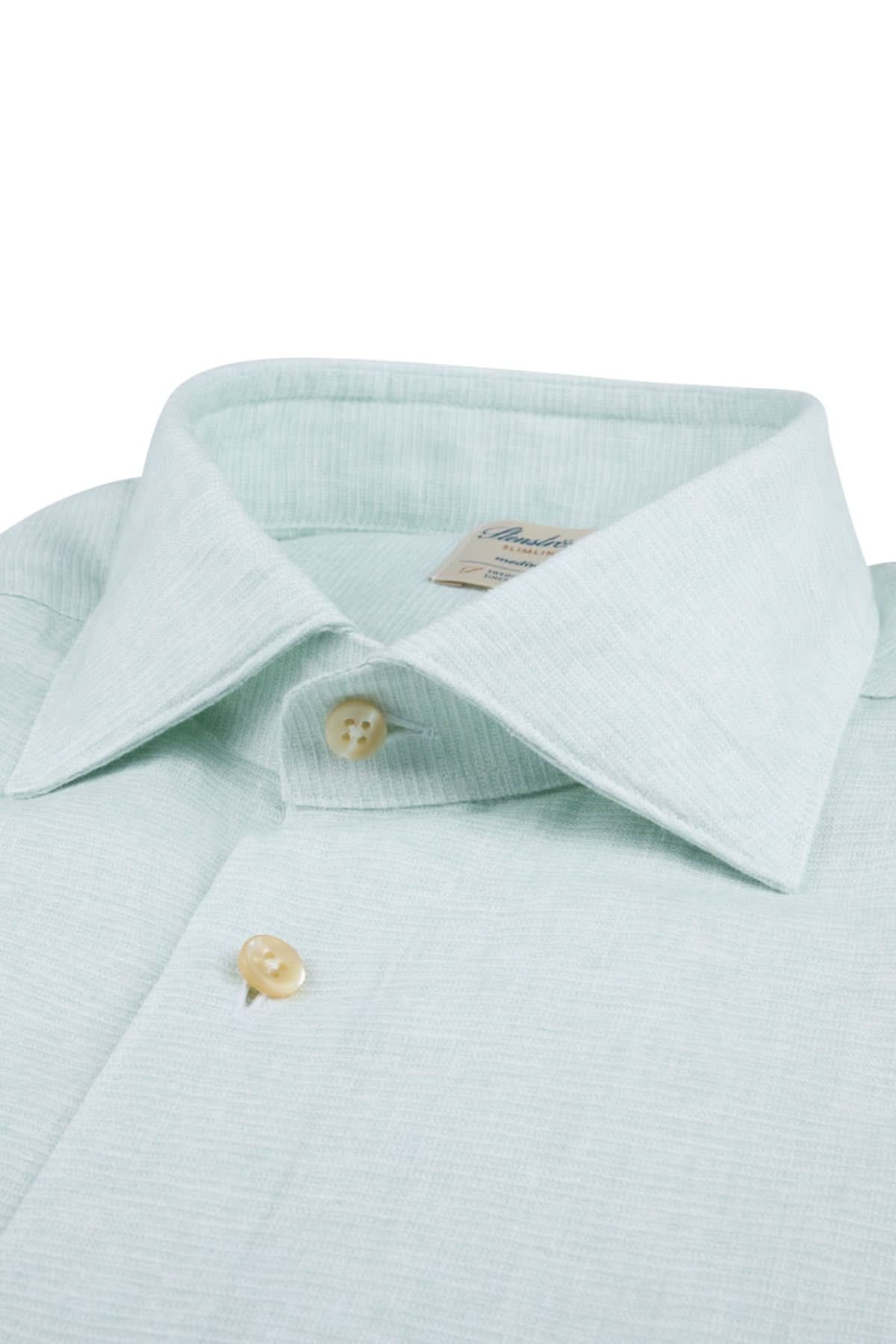 Détail d'une chemise à manches longues en lin avec col classique et boutons en nacre, coloris doux.