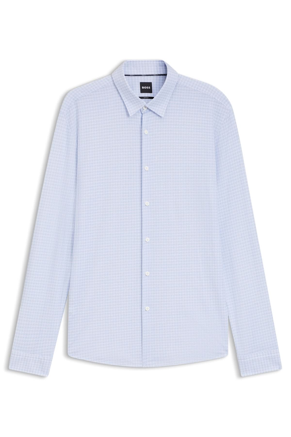 Homme portant une chemise à motif moderne Roan Kent BOSS, coupe ajustée avec col Kent classique et poignets arrondis, idéal pour bureau.