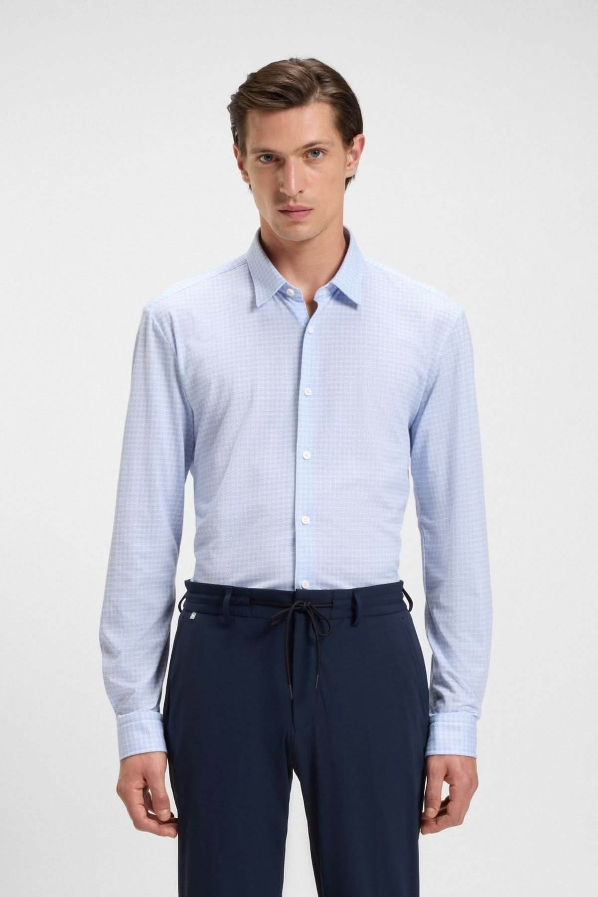 Homme portant une Chemise à motif moderne Roan Kent en tissu flex-weave, coupe ajustée, idéale pour un look raffiné. Bureau ou veston.