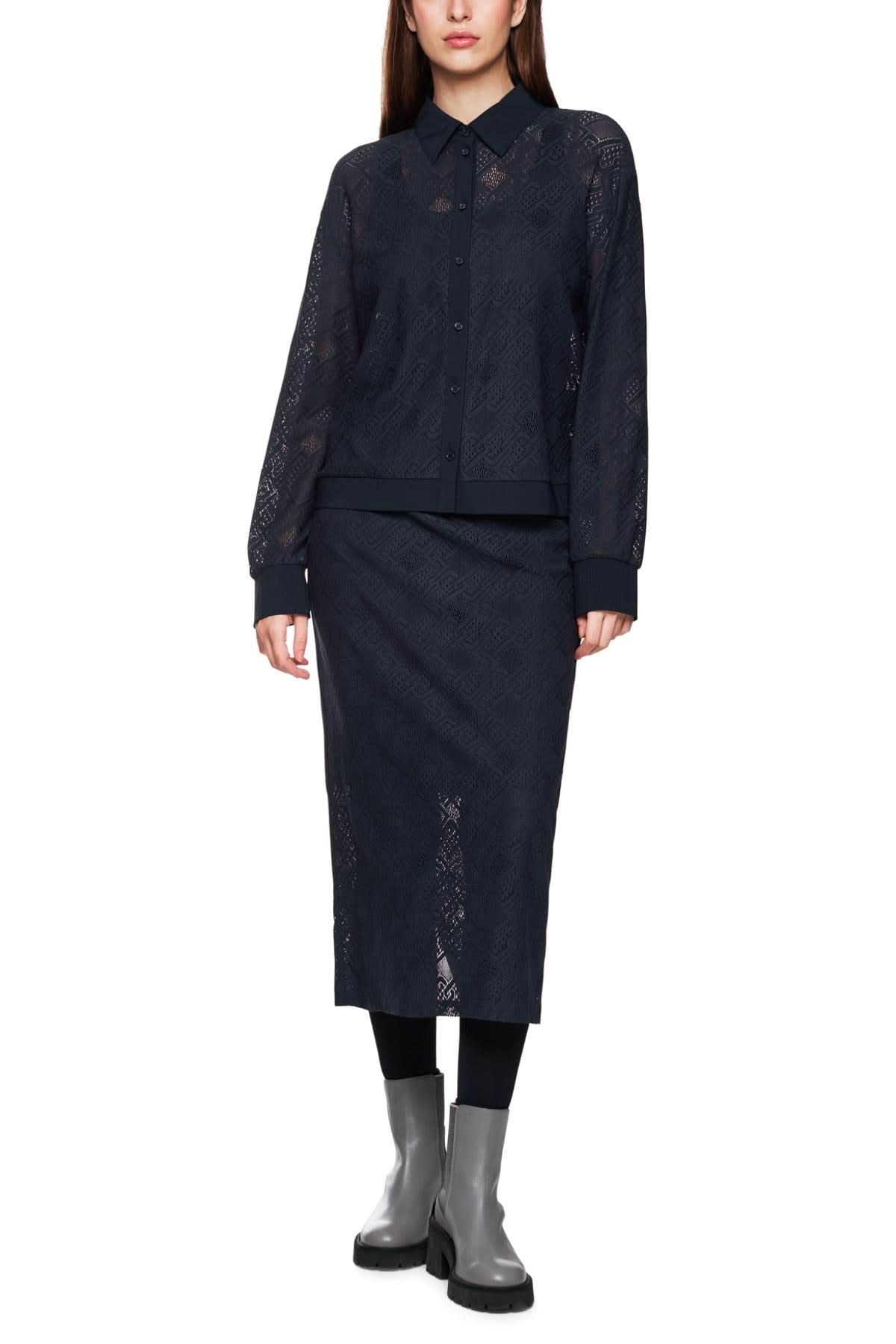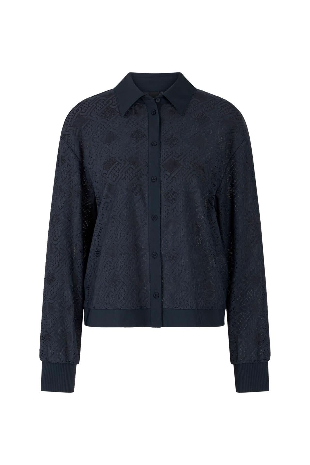 Description: Cette chemise en dentelle ajourée séduit par sa coupe décontractée et son look à la fois féminin et sportif. Confectionnée dans une matière extensible, elle offre un confort optimal tout au long de la journée. Son motif logo en pointe et ses finitions épurées ajoutent une touche moderne. À porter avec une jupe ou un pantalon taille haute pour un effet chic effortless.