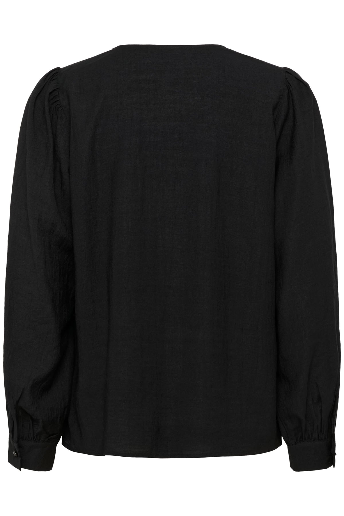 Description: Chemise fluide et élégante à col V, ornée de finitions en dentelle ajourée le long de la boutonnière. Ses manches longues légèrement bouffantes et ses poignets boutonnés lui confèrent un style raffiné et intemporel. Conseil style : associe-la à un jean ou à un pantalon habillé pour un look chic au quotidien ou en soirée.