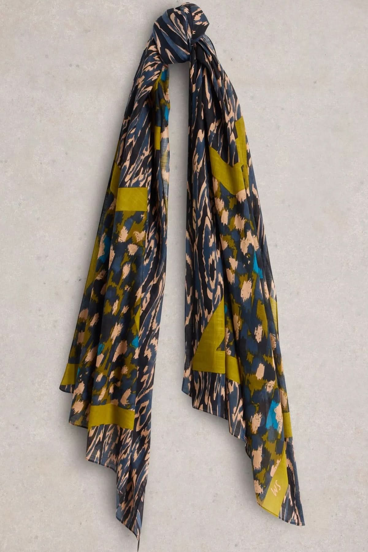 DESCRIPTION : Cette écharpe avec des motifs d'étoiles, est fabriquée en coton biologique doux et en viscose. Elle est donc très légère.