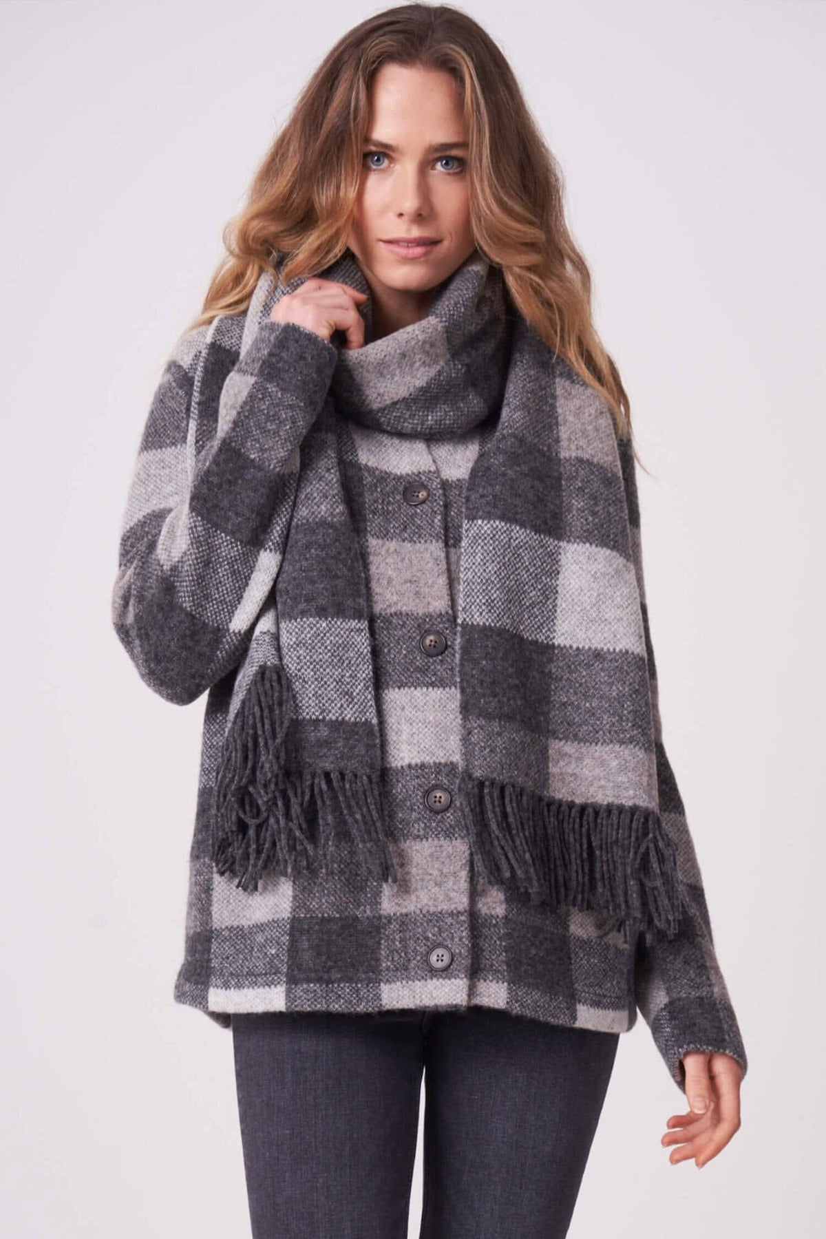 Description: Long foulard rectancle à carreaux dans les couleurs de gris et beige. Petites franges à chaque extrémité. D'un côté il y a l'imprimé à carreaux et l'envers est uni.