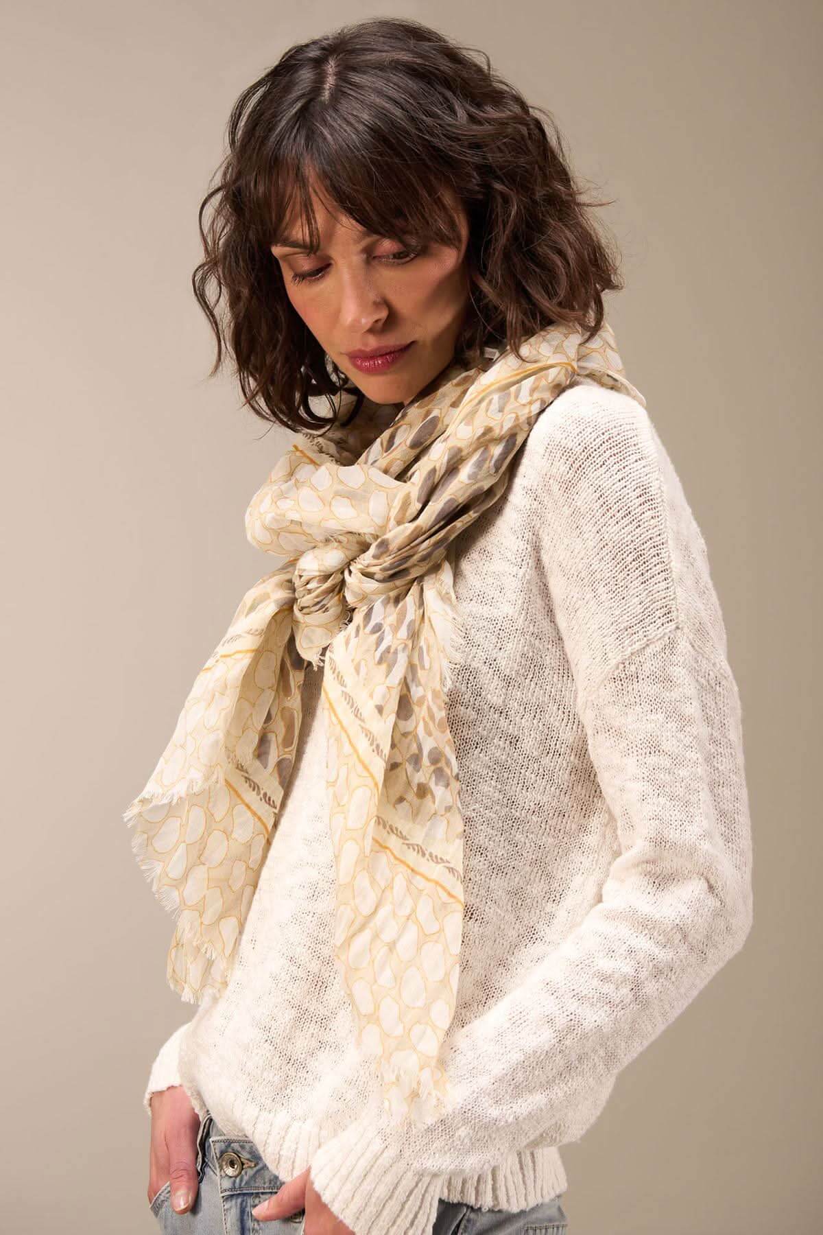 Description : Écharpe au format généreux de 100 x 200 cm, idéale pour une multitude de styles. Drapée autour du cou ou jetée sur les épaules, elle apporte une touche sophistiquée à toutes vos tenues. Son imprimé exclusif, dessiné à la main, lui confère un charme unique, tandis que ses bords frangés ajoutent une finition décontractée. Confectionnée en coton bio issu de cultures certifiées, elle allie douceur et légèreté.