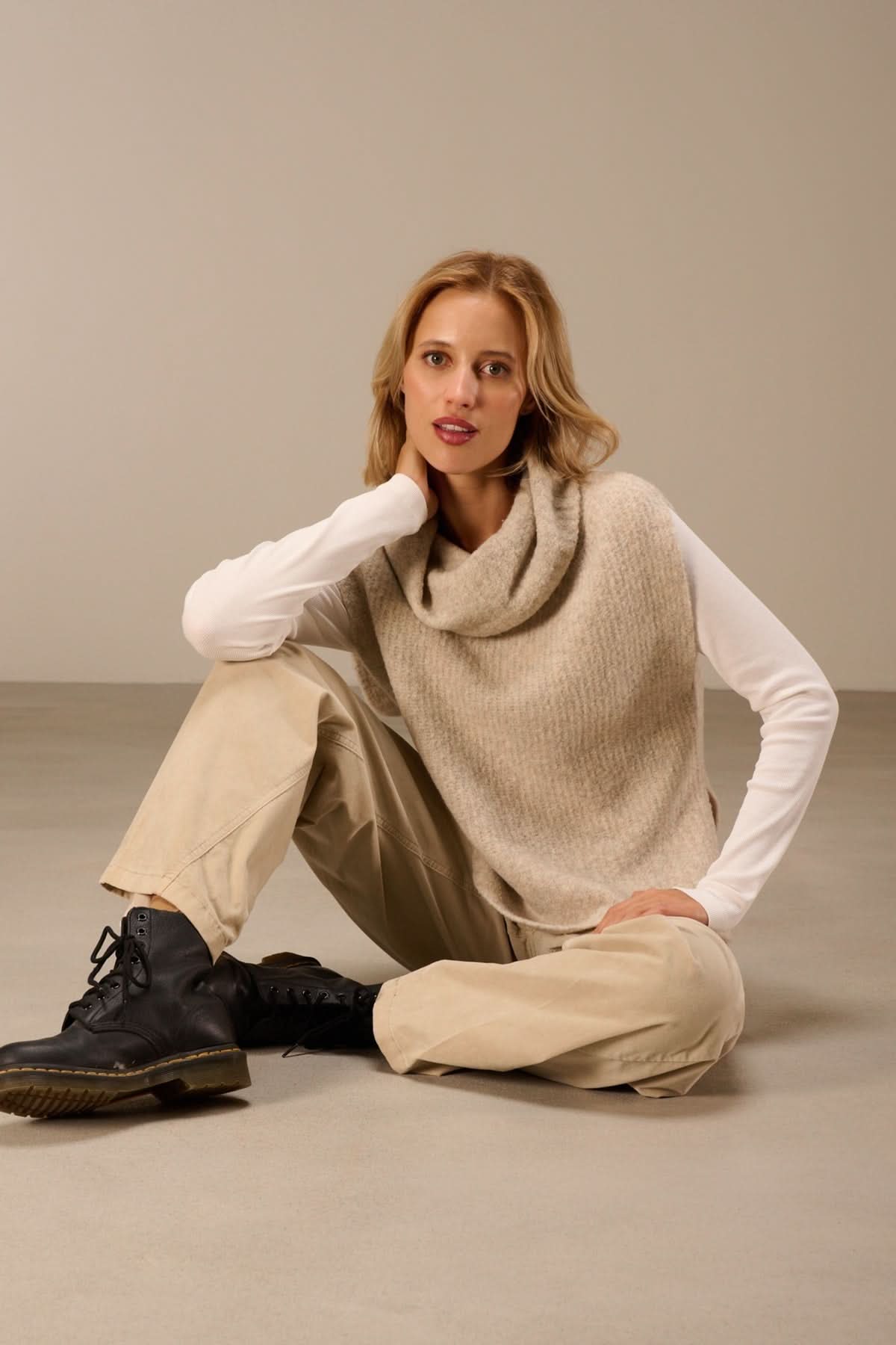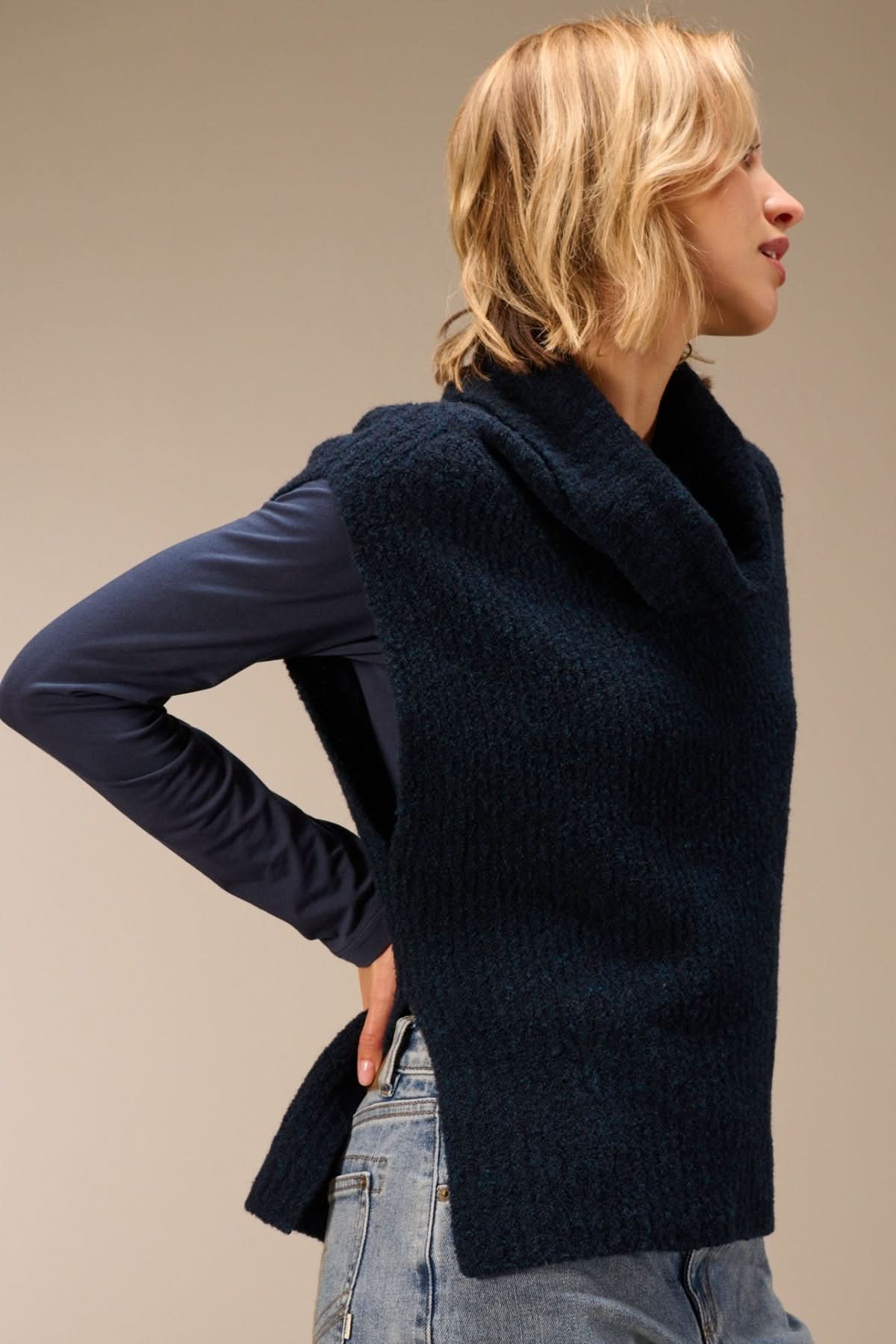 Description: Ce gilet sans manches en maille bouclée offre une coupe boîte confortable avec un col drapé enveloppant. Les emmanchures profondes et les fentes côtés facilitent la superposition tout en laissant une belle aisance. Conseil style : porte-le sur un t-shirt à manches longues ou une chemise pour créer un contraste de textures élégant.
