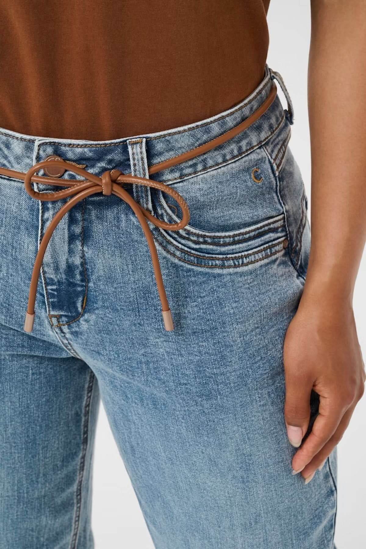 Jean à coupe droite décontractée avec lien ajustable, finition légèrement délavée et taille régulière.