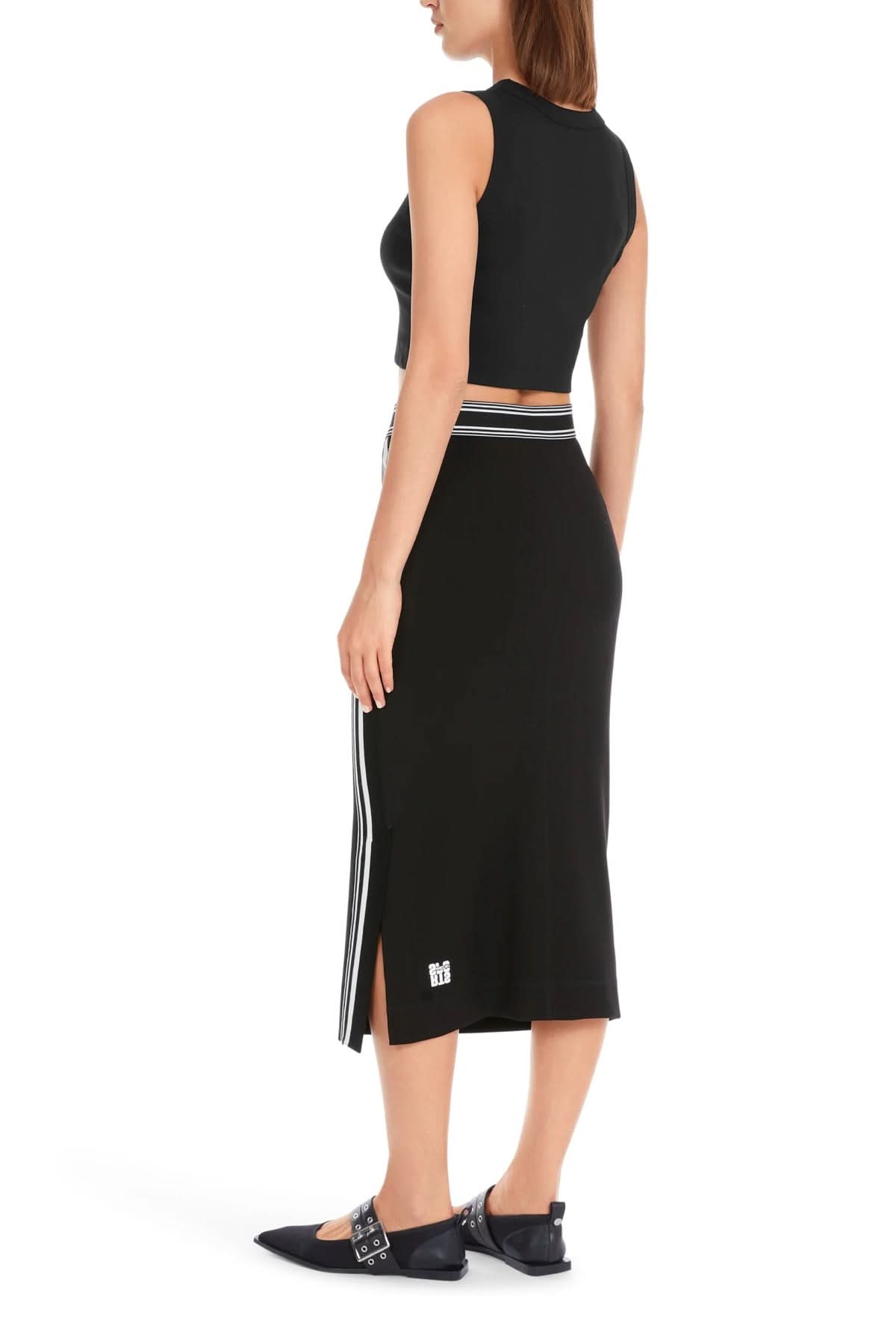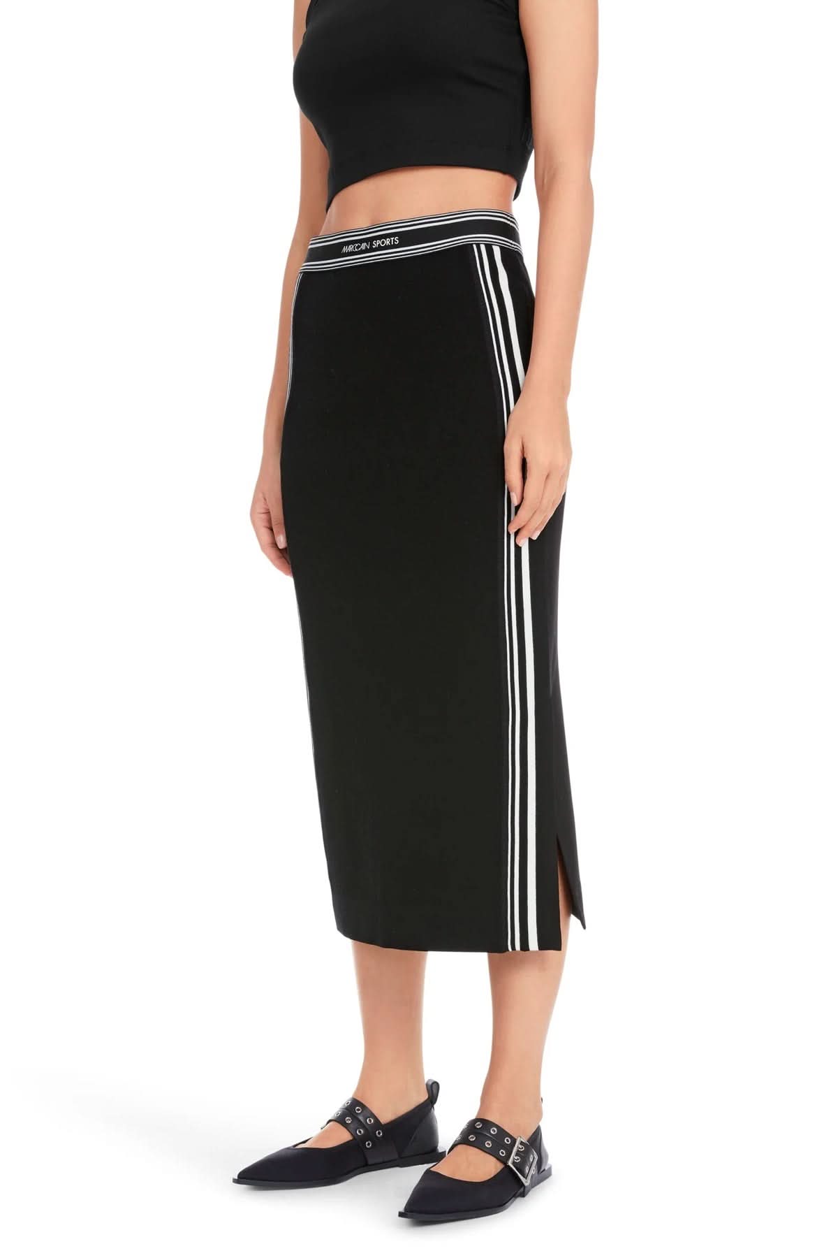 Description : Jupe étroite avec fente latérale. Le modèle a deux faces le devant est en tricot, le dos en jersey. Avec une large bande de ceinture élastique. La jupe est produite selon des critères éco-sociaux et porte le label de durabilité « Rethink Together ».