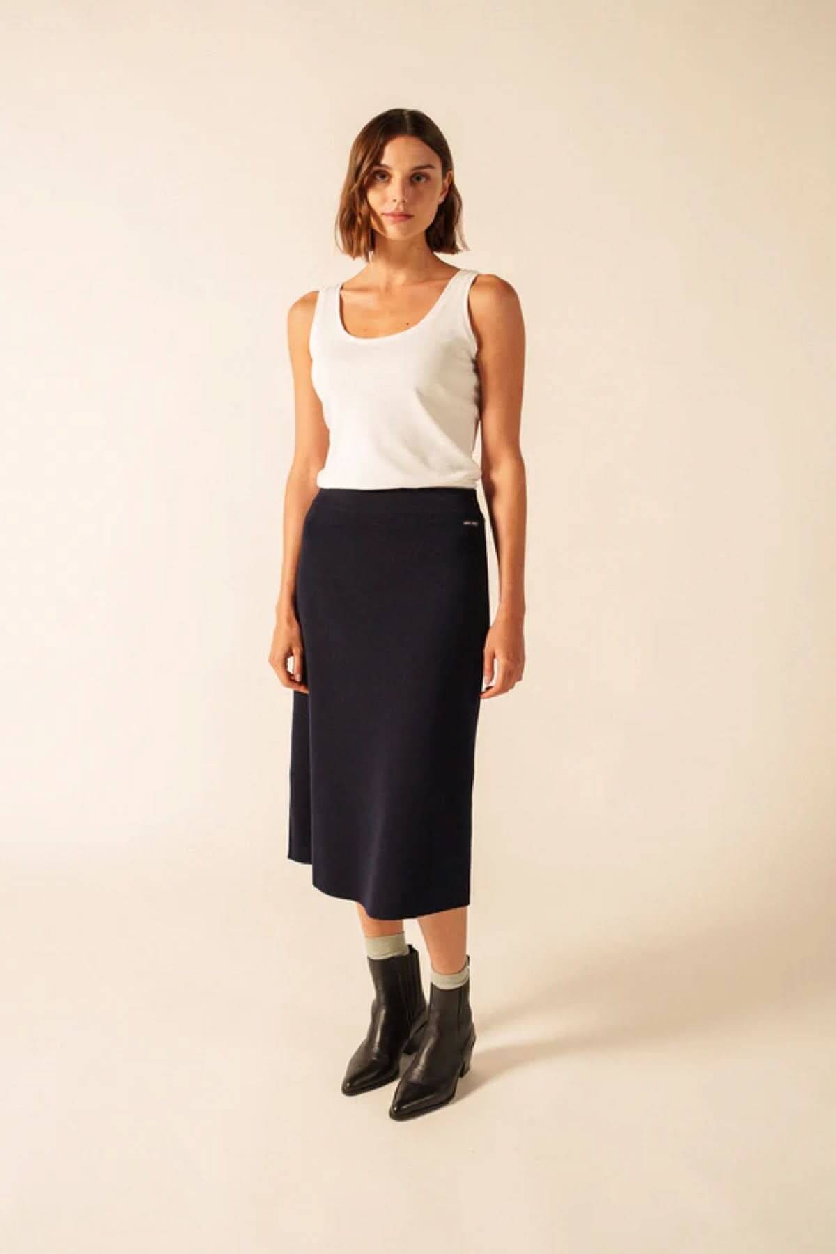 Description : Cette jupe midi en laine séduit par sa coupe fluide et épurée. Sa silhouette droite légèrement évasée souligne la féminité avec sobriété, tandis que la texture douce de la laine assure chaleur et confort. Un modèle intemporel qui se marie aussi bien avec un chandail en maille qu’une chemise structurée.