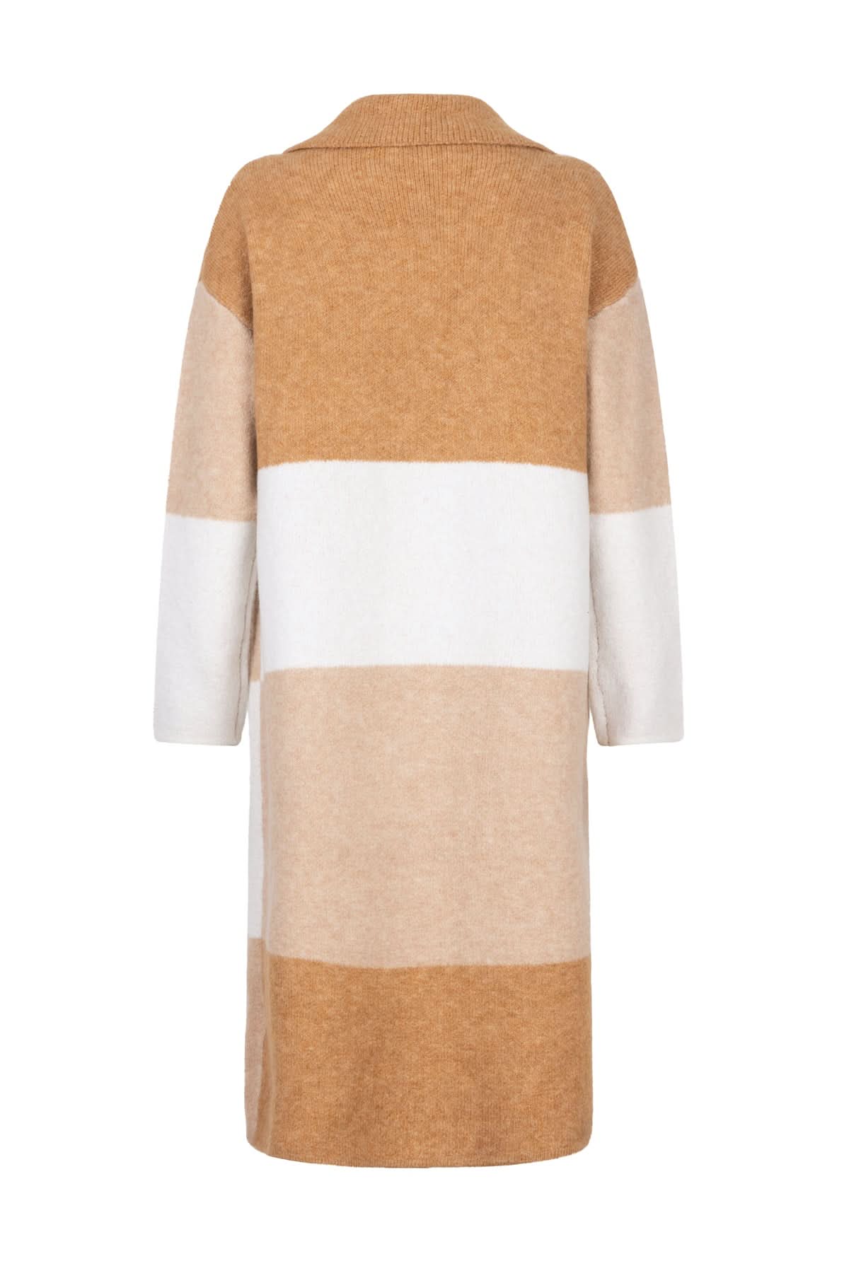 Description : Ce manteau long à rayures joue sur les contrastes doux avec sa palette chaleureuse et sa texture moelleuse. Sa coupe droite et son col à revers lui confèrent une allure moderne et enveloppante. Conseil style : portez-le sur un ensemble monochrome pour laisser les rayures s’exprimer pleinement.
