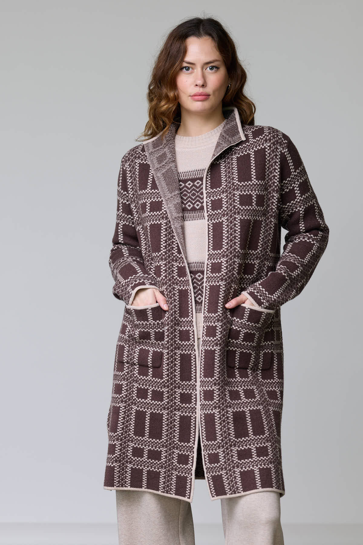 Description : Ce manteau en tricot à motif géométrique offre un équilibre parfait entre confort et style. Sa coupe droite et son design structuré apportent une touche graphique et moderne à votre garde-robe de saison.