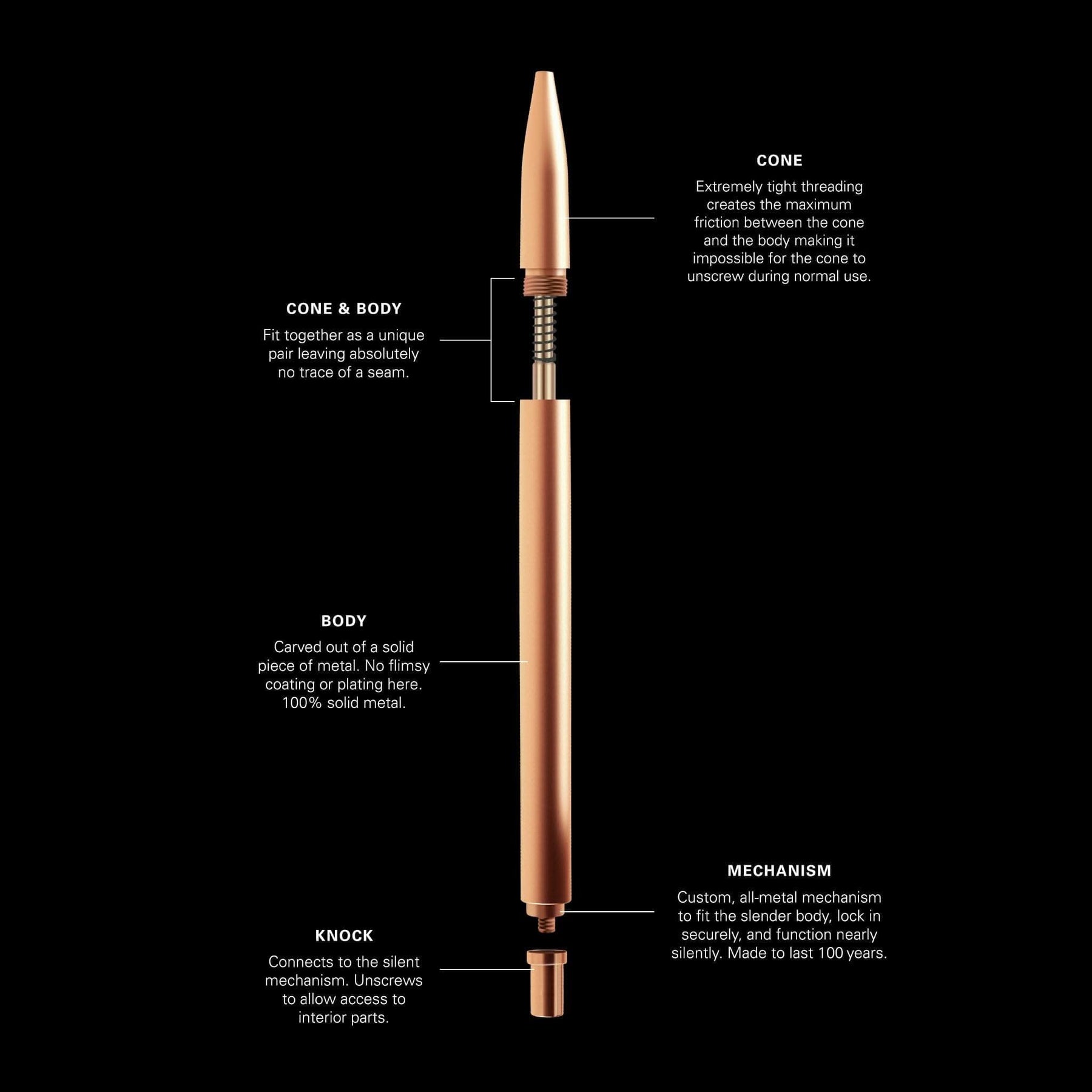 Stylo Modern Fuel features detailed construction: cone, body, mechanism, and knock for ultimate durability and design.