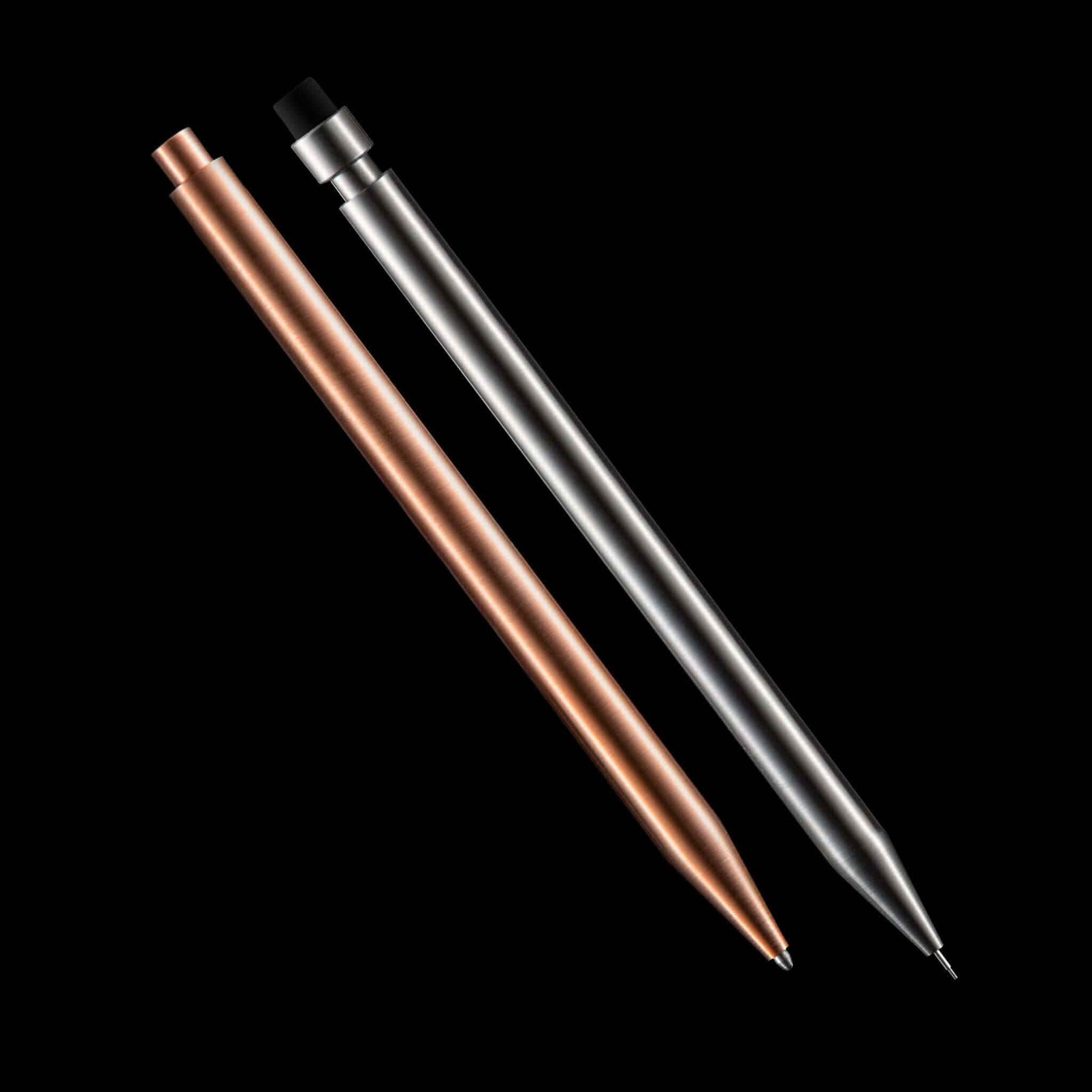 Stylo Modern Fuel: ensemble de stylos en métal cuivré et argenté sur fond noir, élégant et design contemporain.