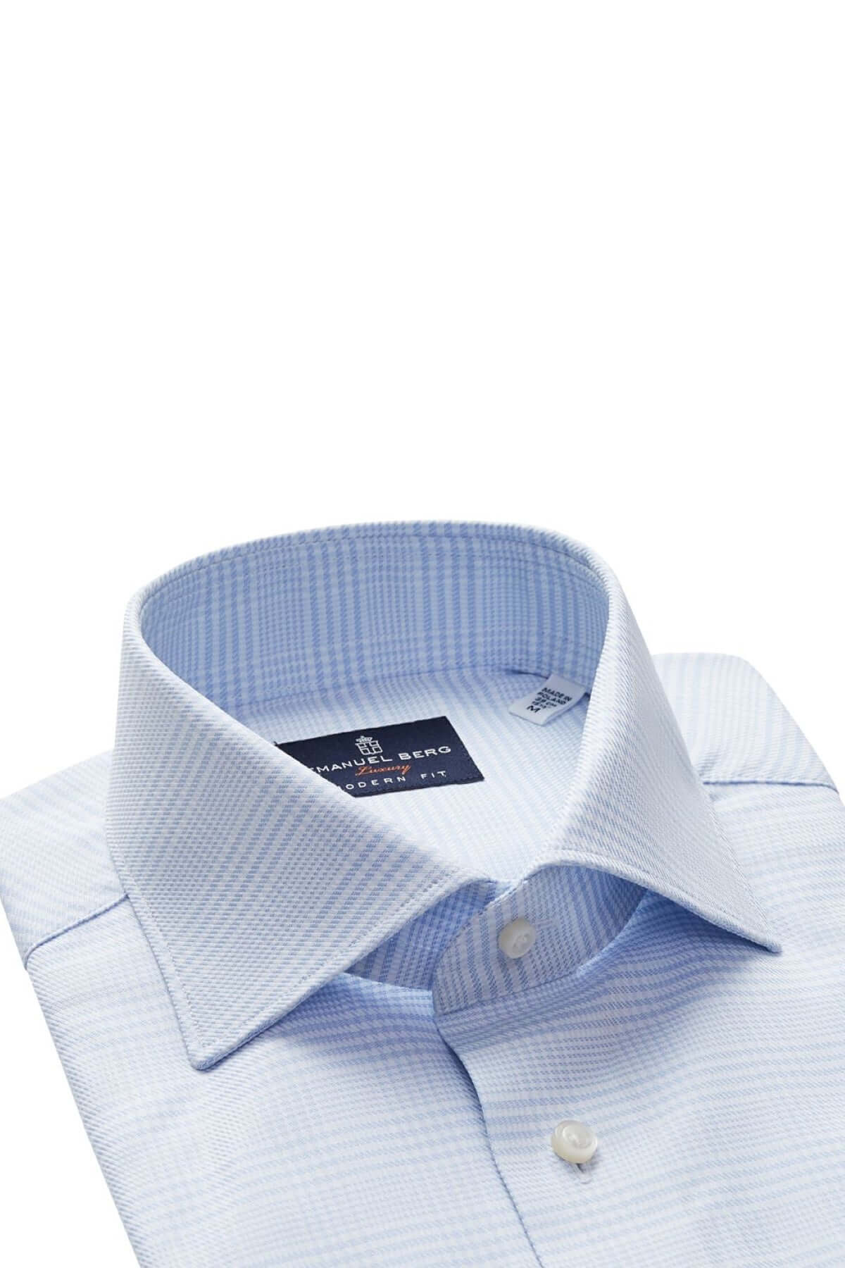 Chemise habillée à carreaux bleus, coupe moderne, col classique et poignets ajustables pour un look élégant.