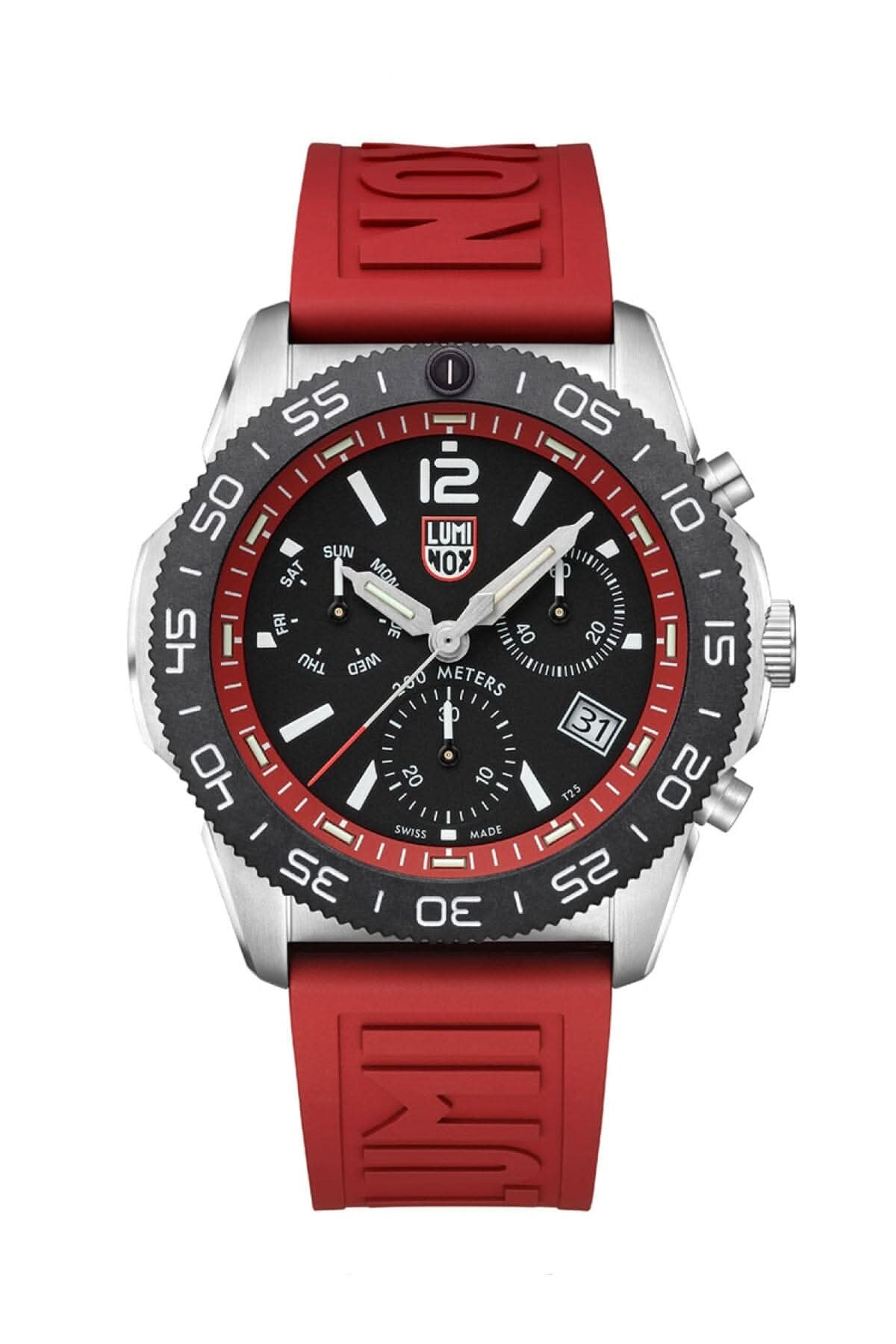Montre Luminox Pacific Diver 3155 avec bracelet en caoutchouc rouge et boîtier en acier inoxydable.