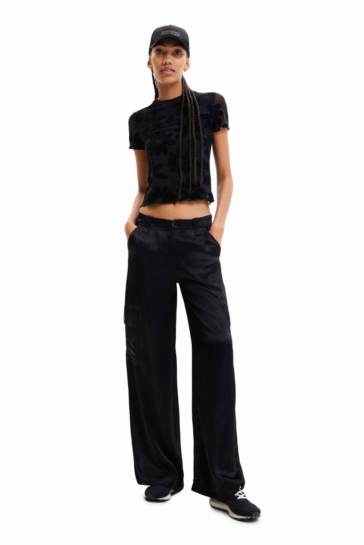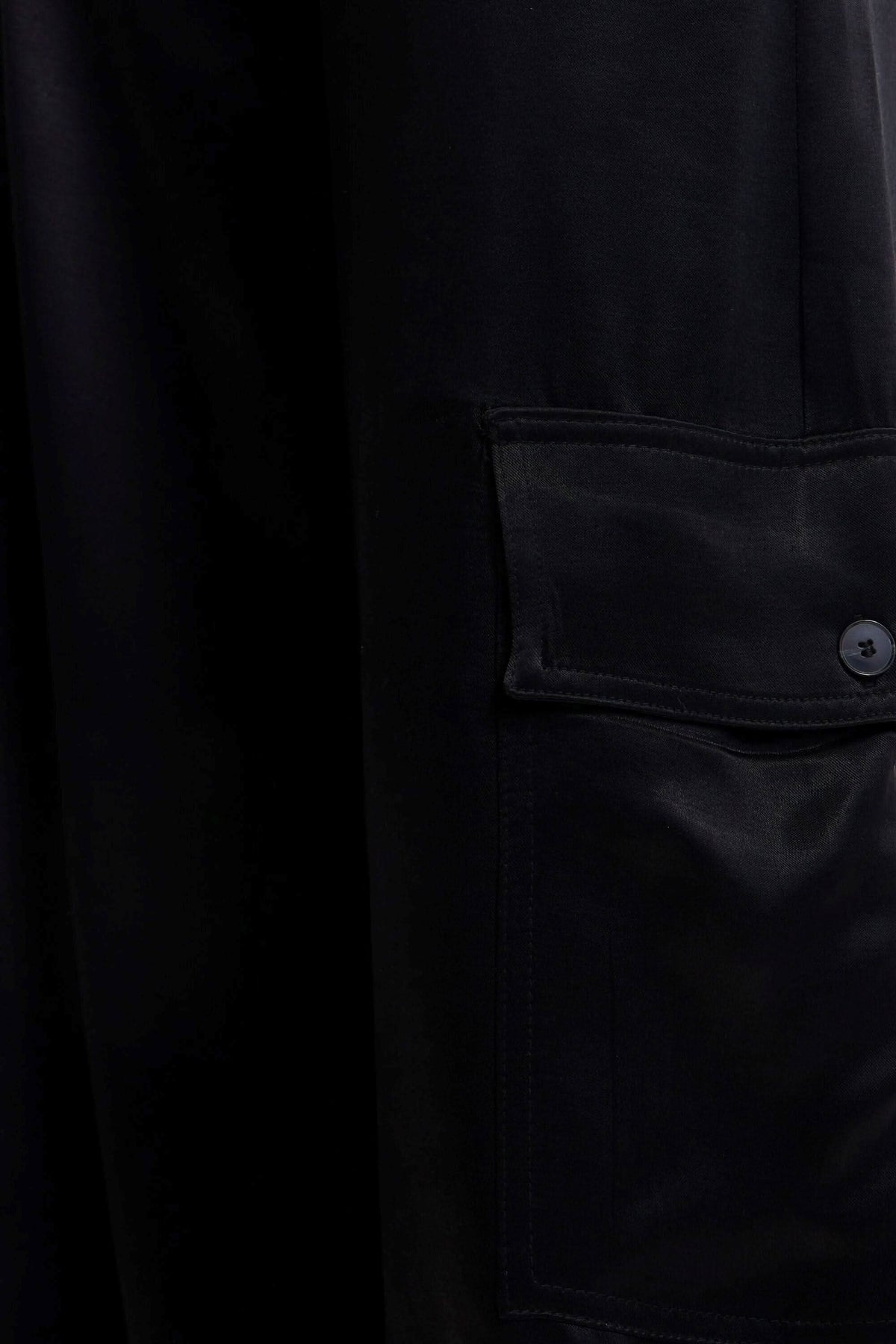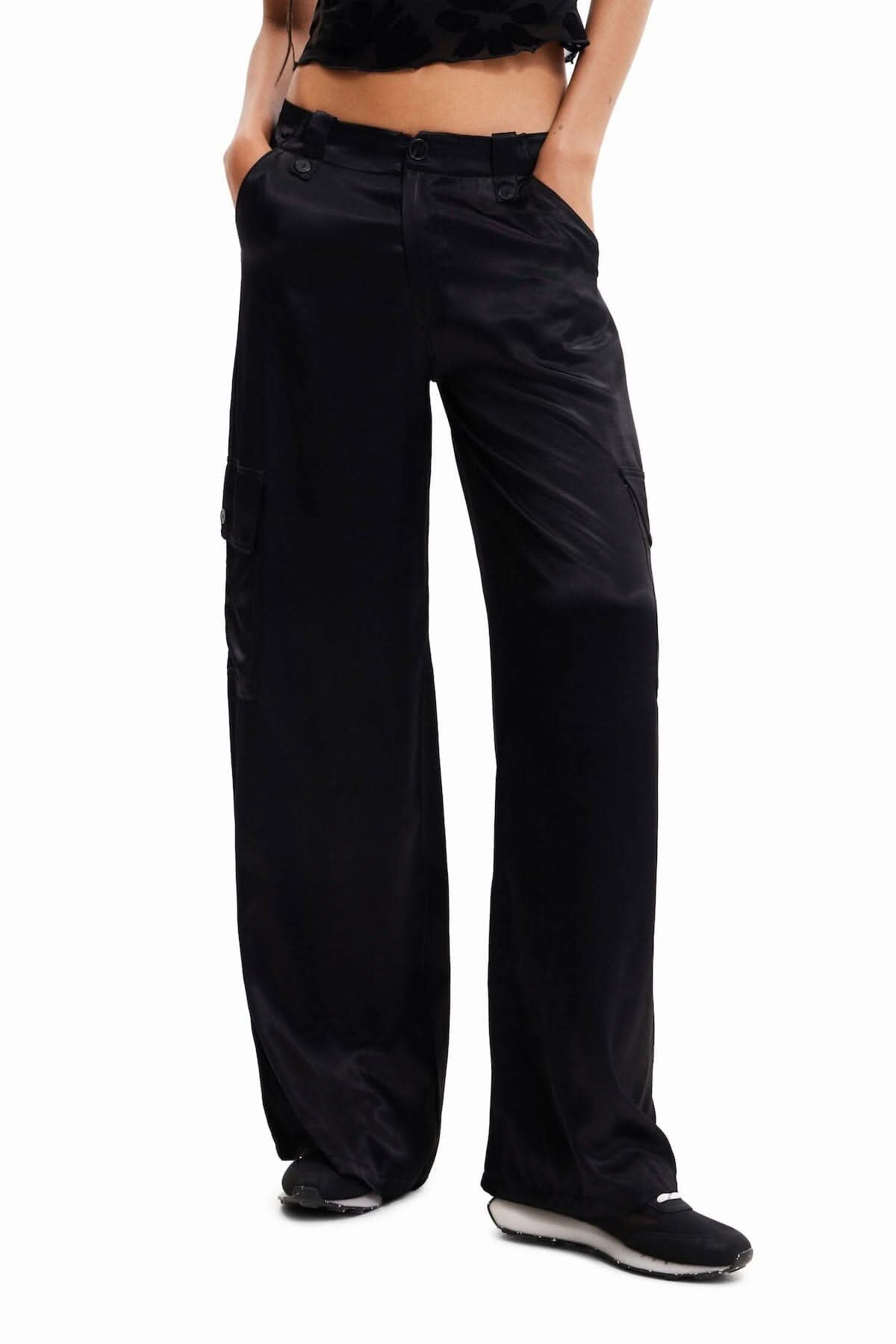 DESCRIPTION: Pantalon long style cargo taille mi-haute en satin fluide avec plusieurs poches. Il comporte deux poches à l'avant et une poche à l'arrière. Il y a également deux poches latérale sur les jambes.