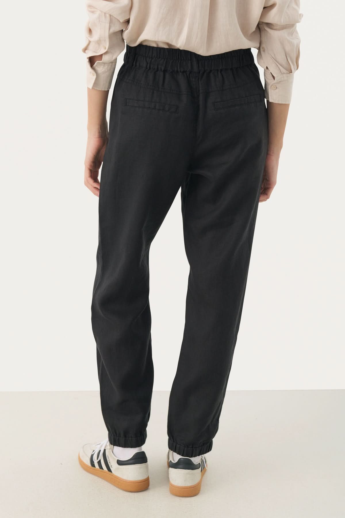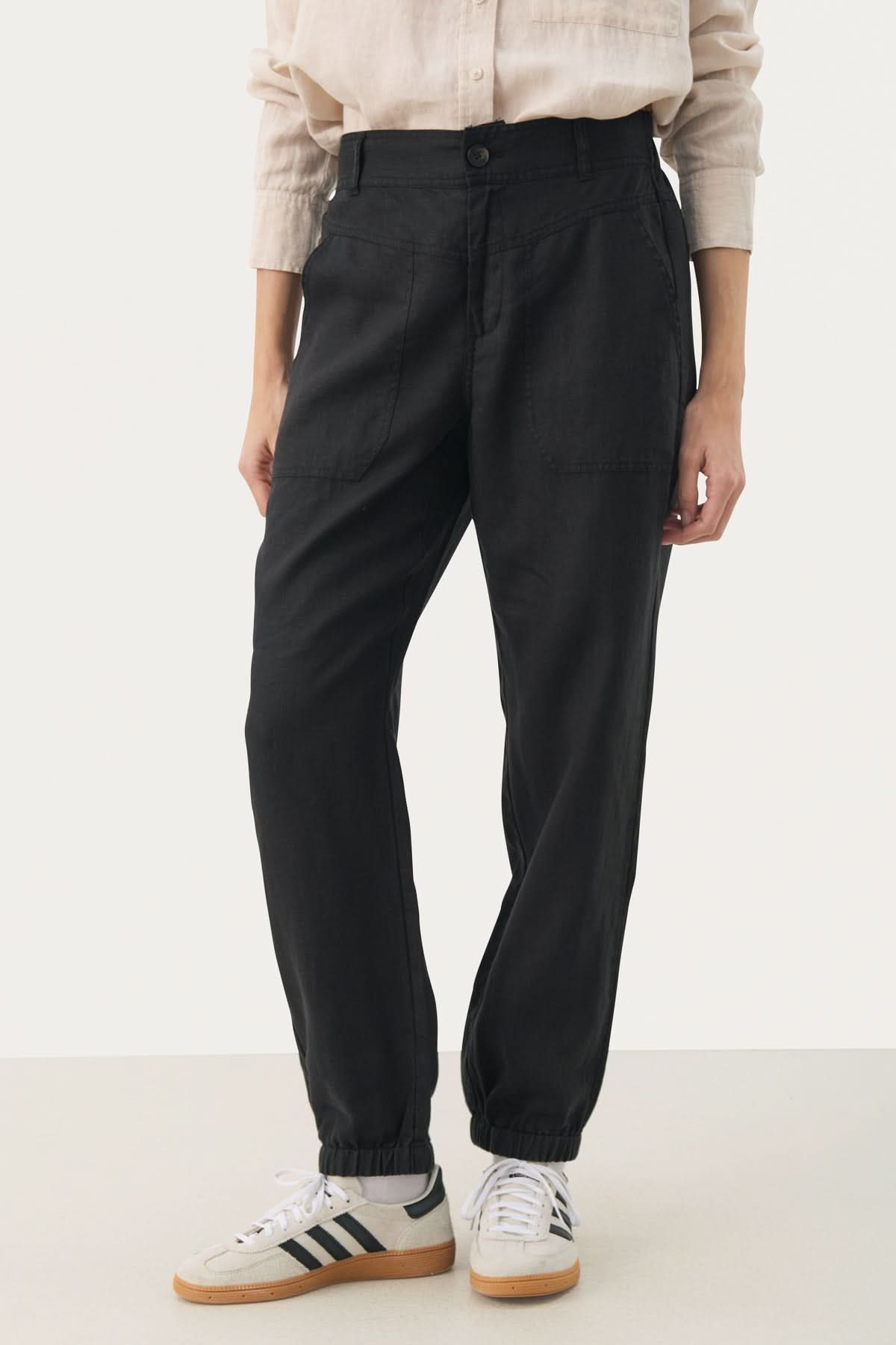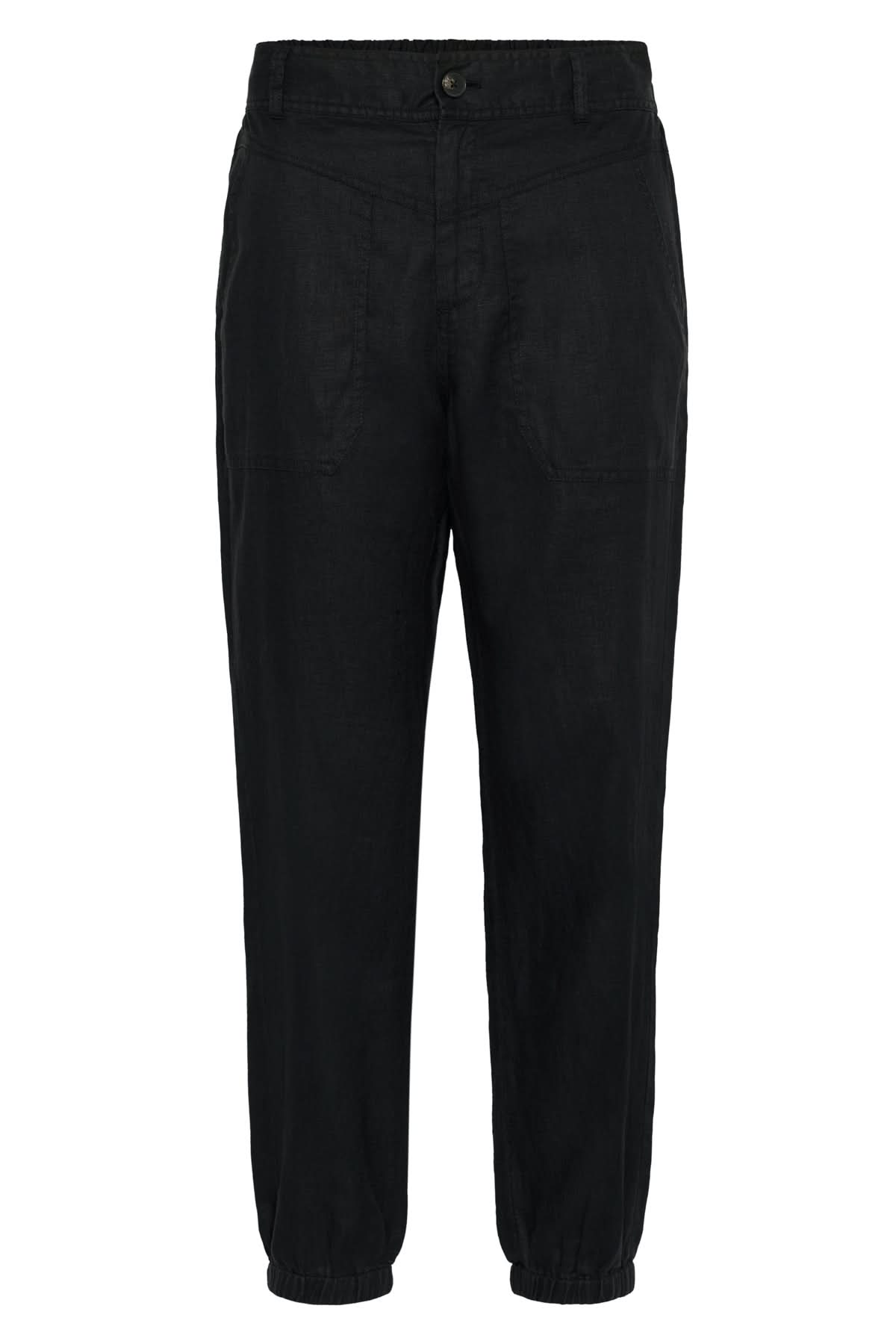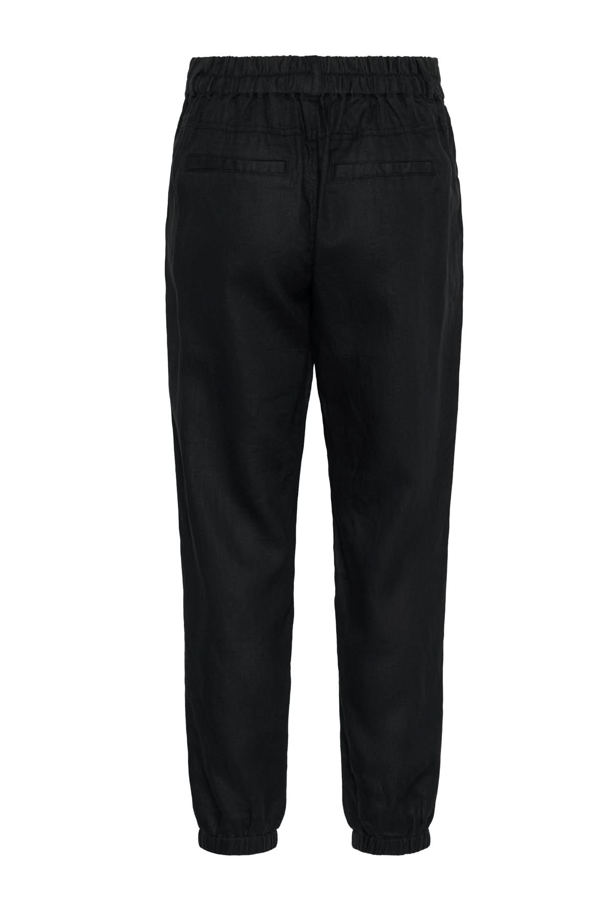 Description : La forme ample du moment qui se serre à la cheville pour un effet relax, sergé structuré fait de lin, fermeture éclaire et bande de taille élastique froncée à l'arrière, poches plaquées à l'avant, fausses poches à l'arrière, chevilles sur élastique, sa coupe est droite et décontractée.