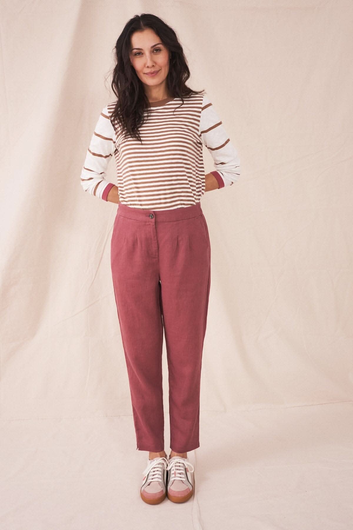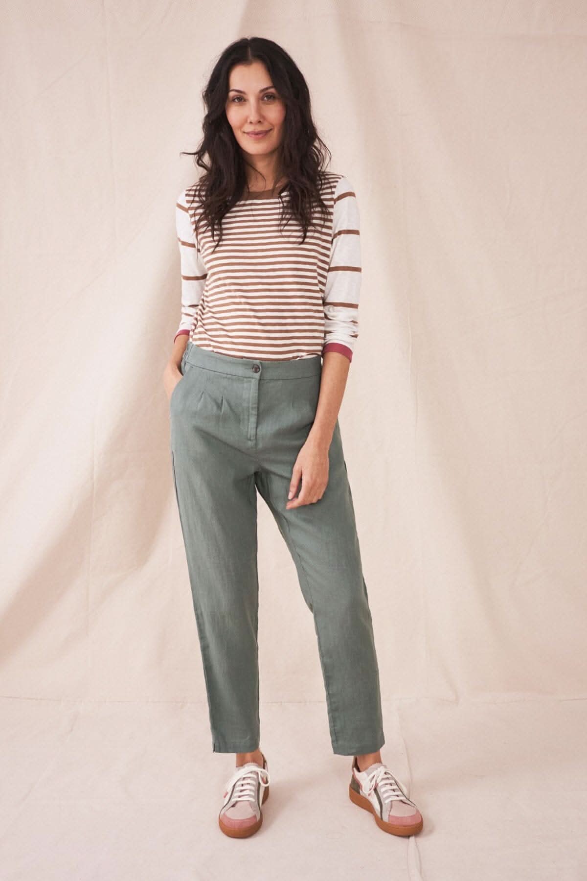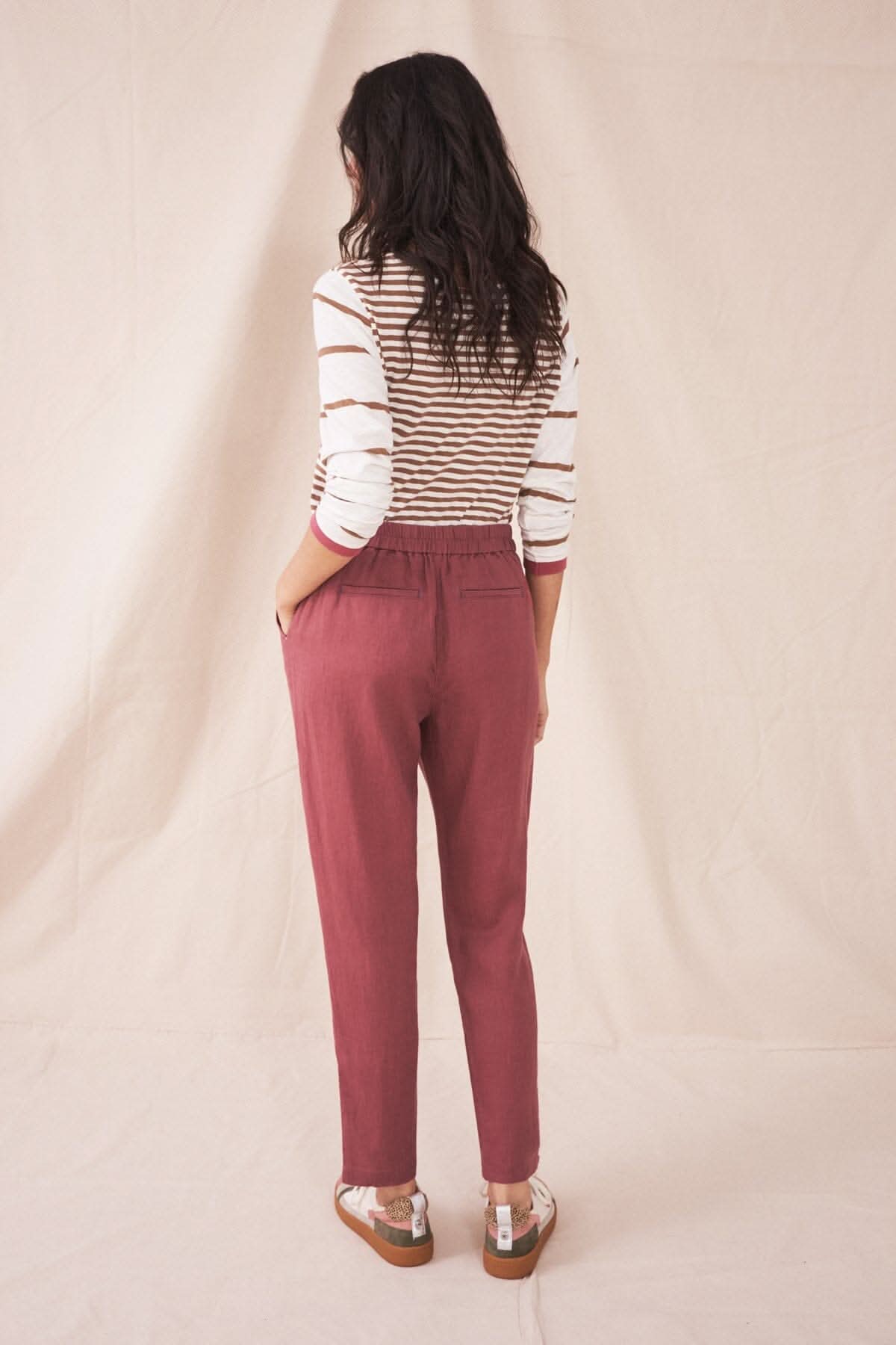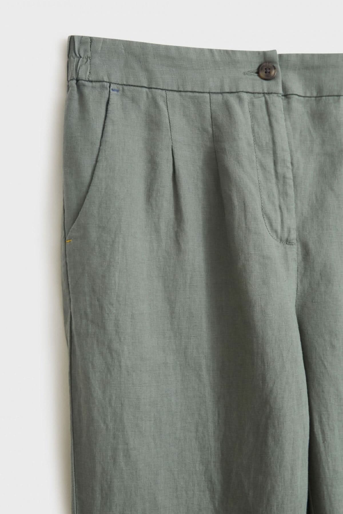 DESCRIPTION: C'est un pantalon avec élastique au dos, rattaché par un bouton à l'avant dont deux pinces de chaque côté de la braguette. Ils sont cousus. Des poches de côté sont en diagonale. Un pantalon aéré avec des poches pratiques. Parfait pour les temps chaud.