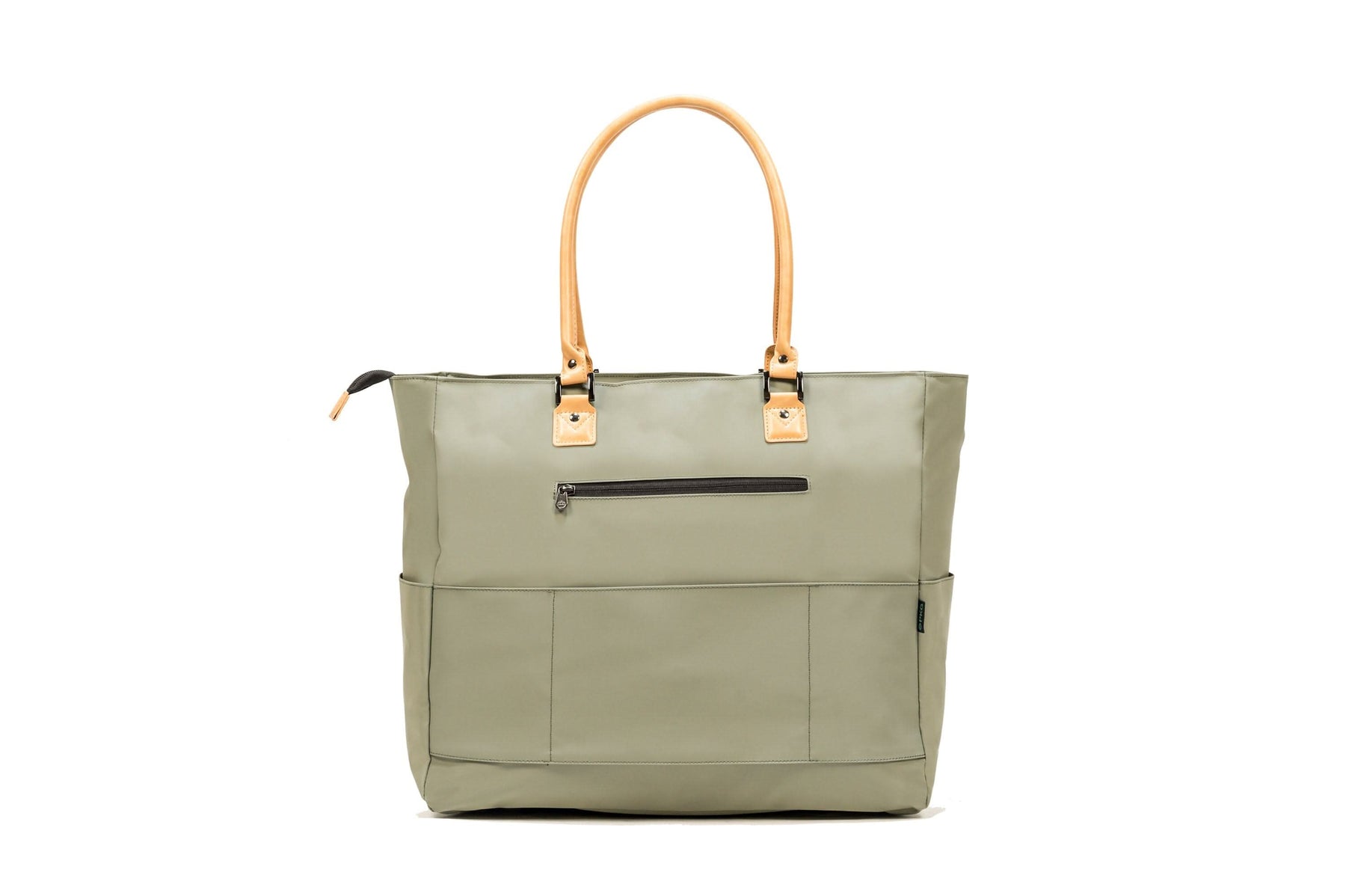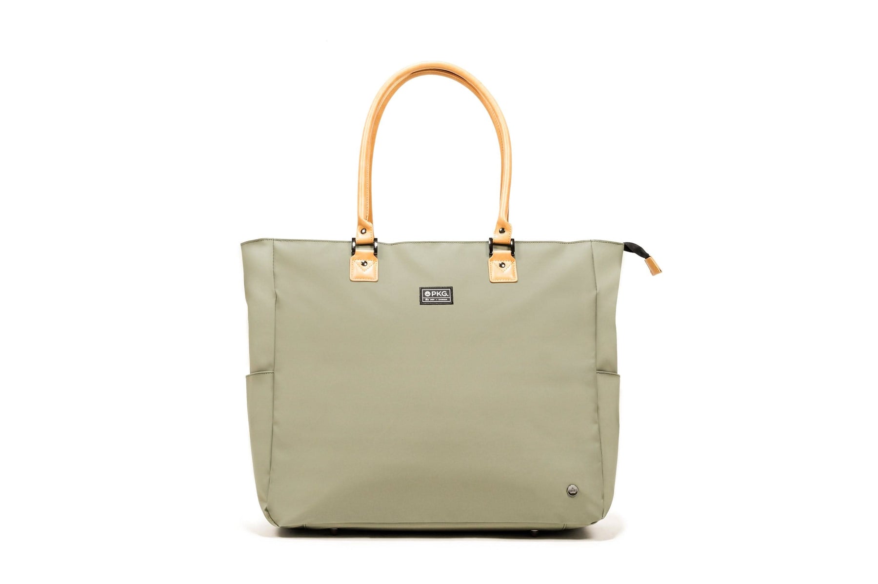 PKG Georgian 33L tote bag in olive green with faux leather accents and sturdy handles.