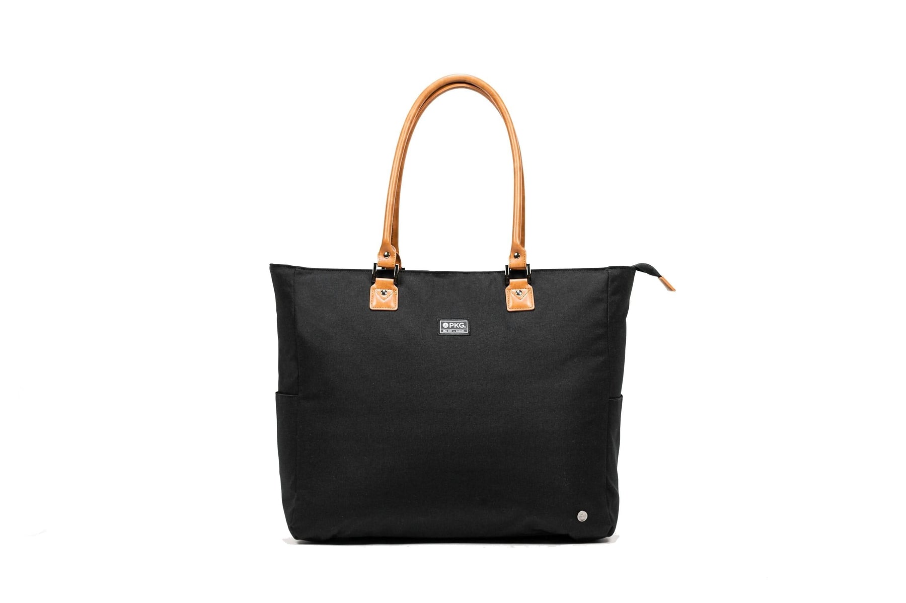 PKG Georgian Recycled 33L Tote Bag in black with faux leather accents and padded base, ideal for travel.