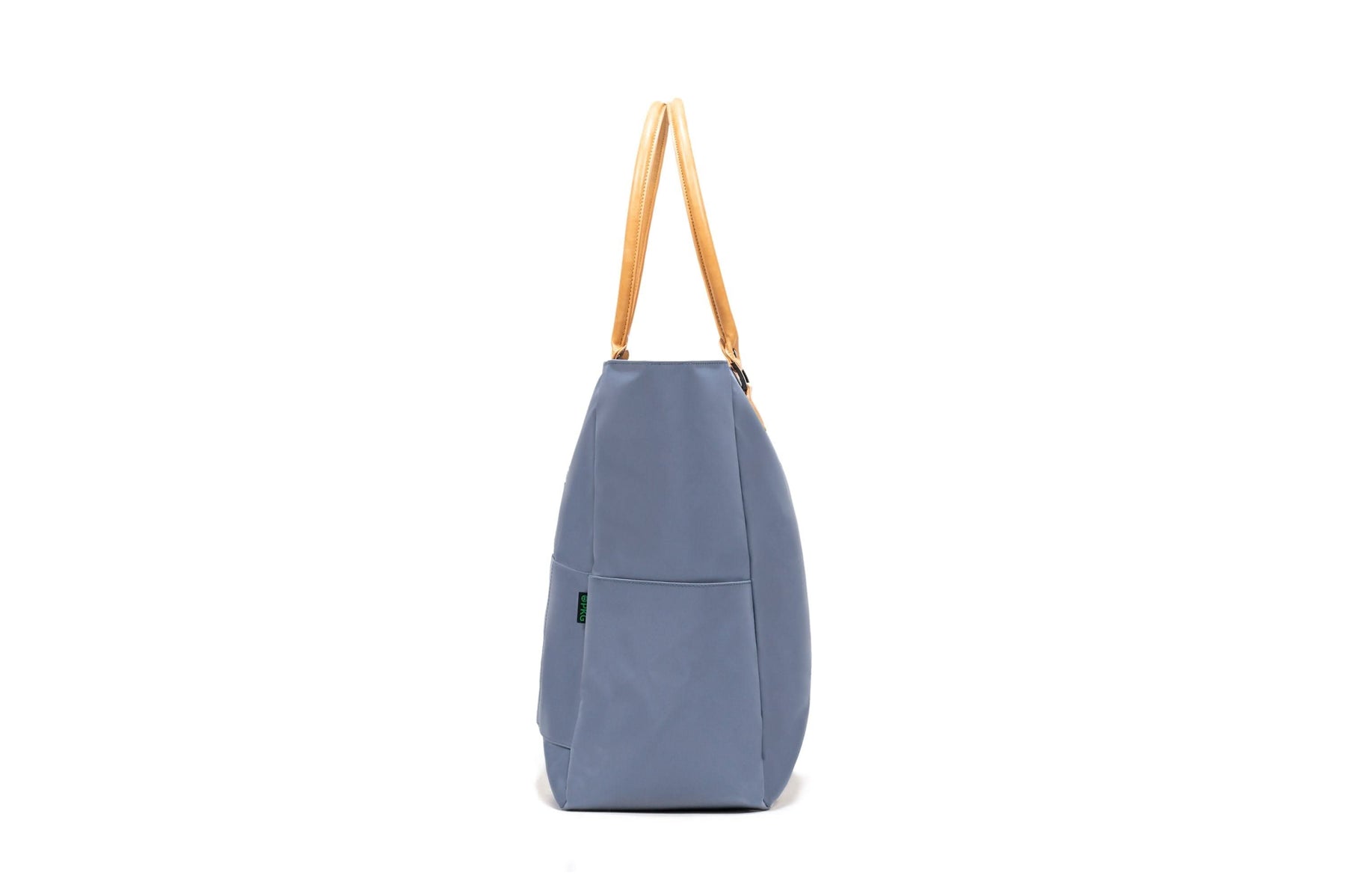 Side view of PKG Georgian 33L tote bag in blue with leather straps, highlighting its sleek design and durable fabric.