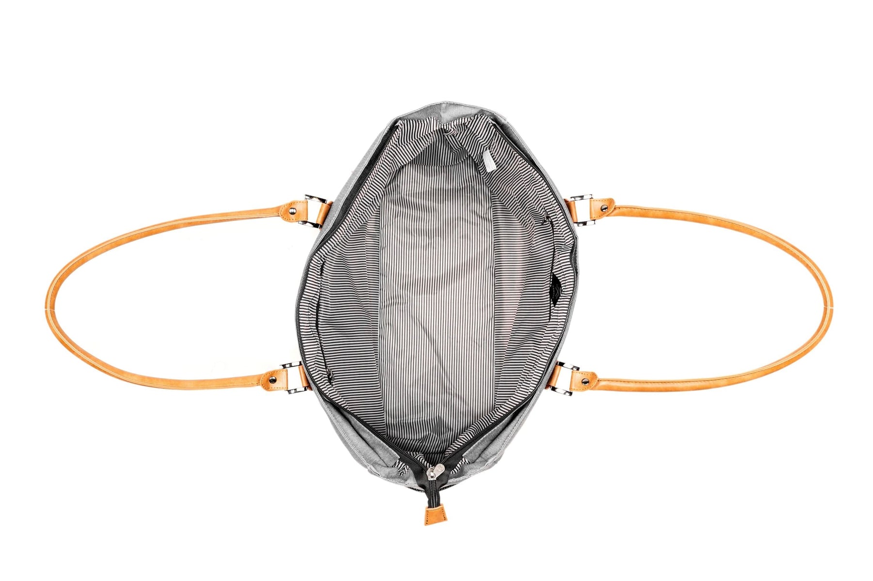 View of the interior of the PKG Georgian 33L tote bag showcasing the striped lining and faux leather straps.