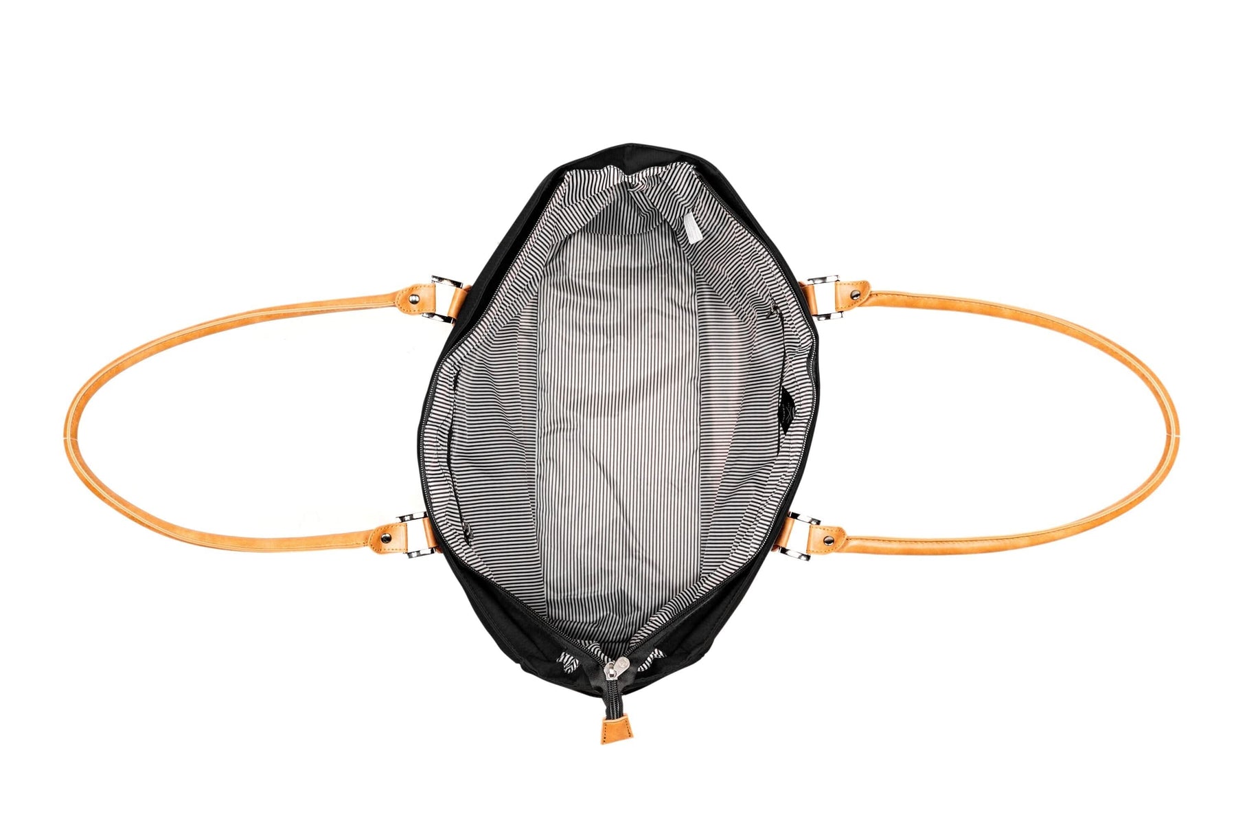 Open PKG Georgian 33L tote bag showing weather-resistant interior and stylish handles.