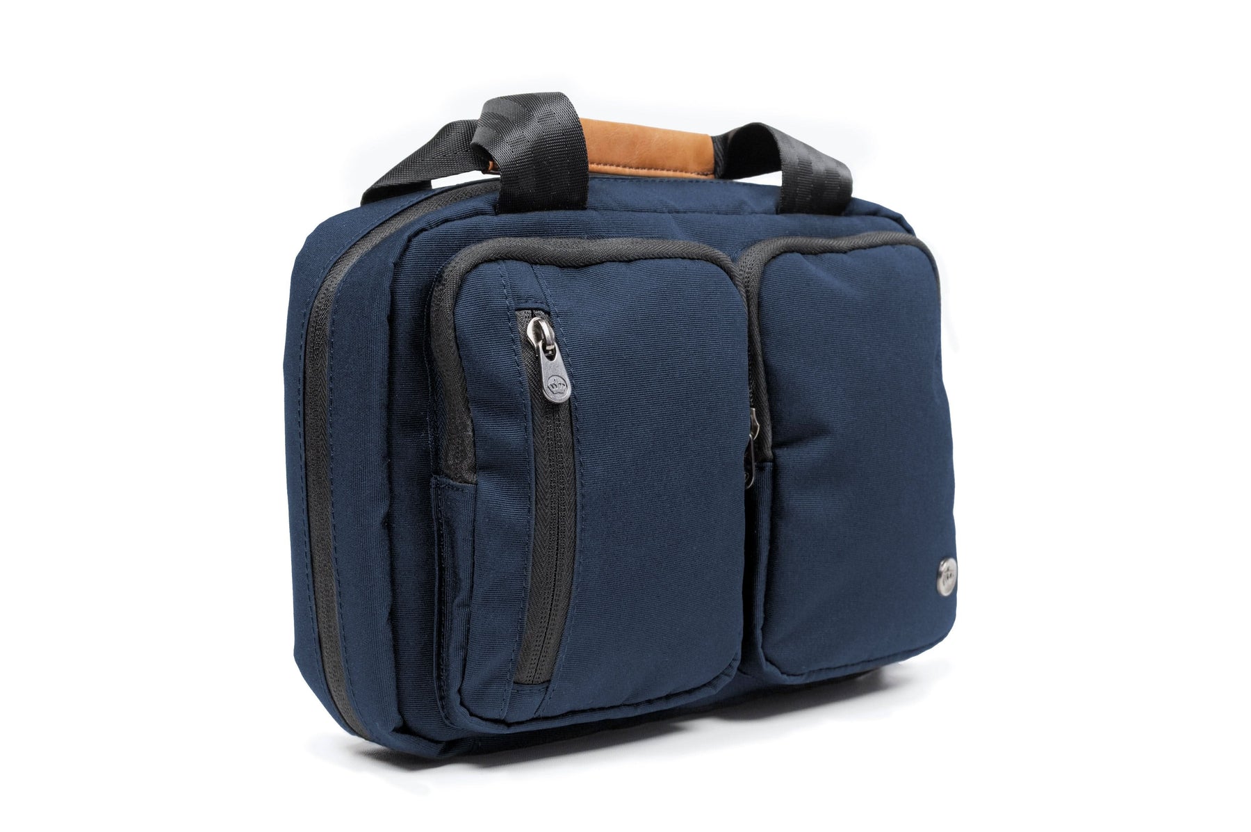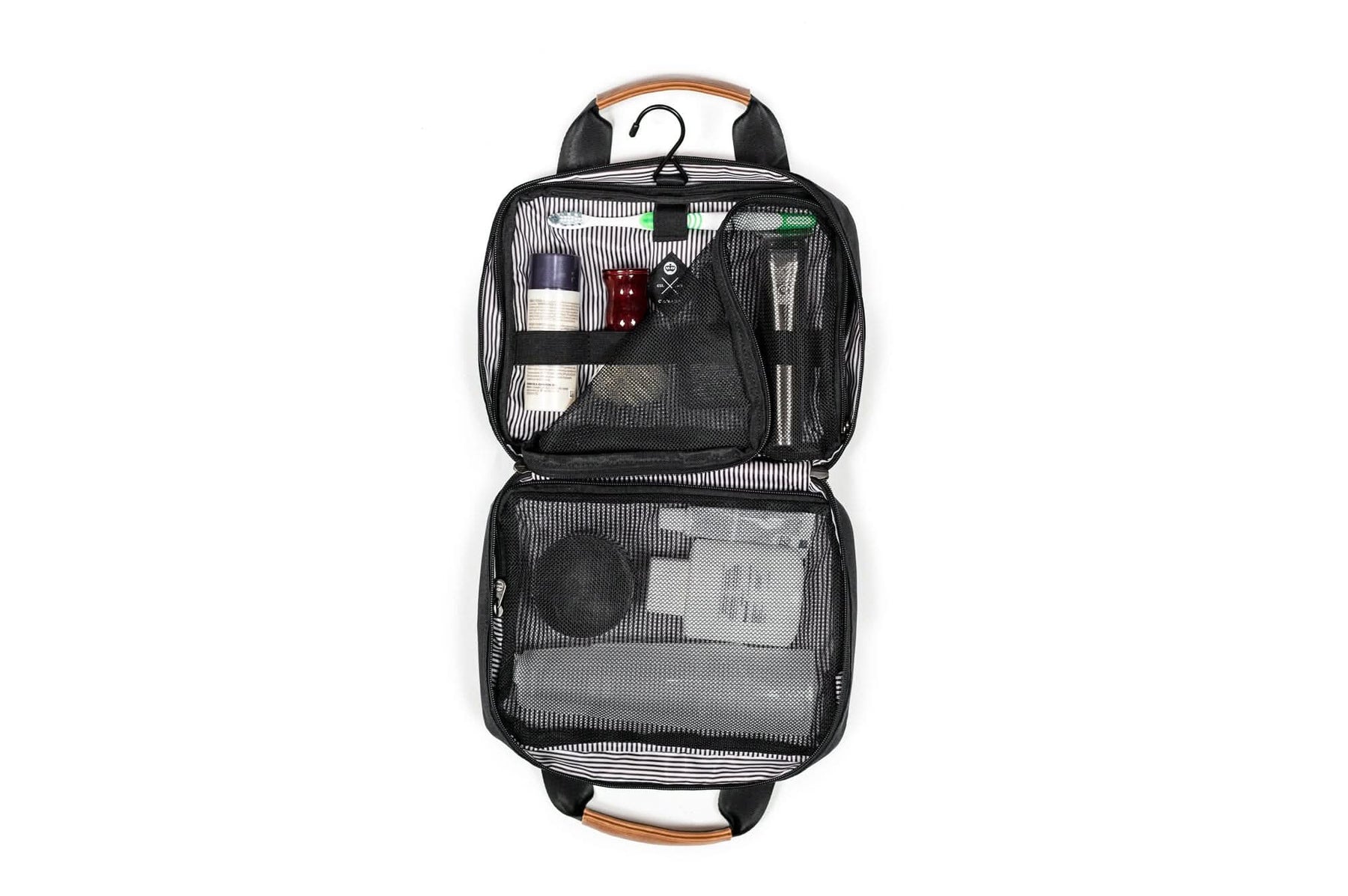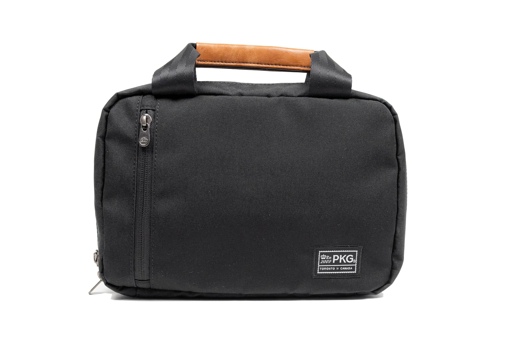 The PKG Simcoe recycled accessory bag is designed with toiletries in mind. Made from weather-resistant, recycled 600D polyester outer fabric and a recycled 210D satin polyester inner fabric. Internal and external organization, vegan leather accents, a metal hanging hook, and elastic organizers keep all your essentials tidy and in reach.