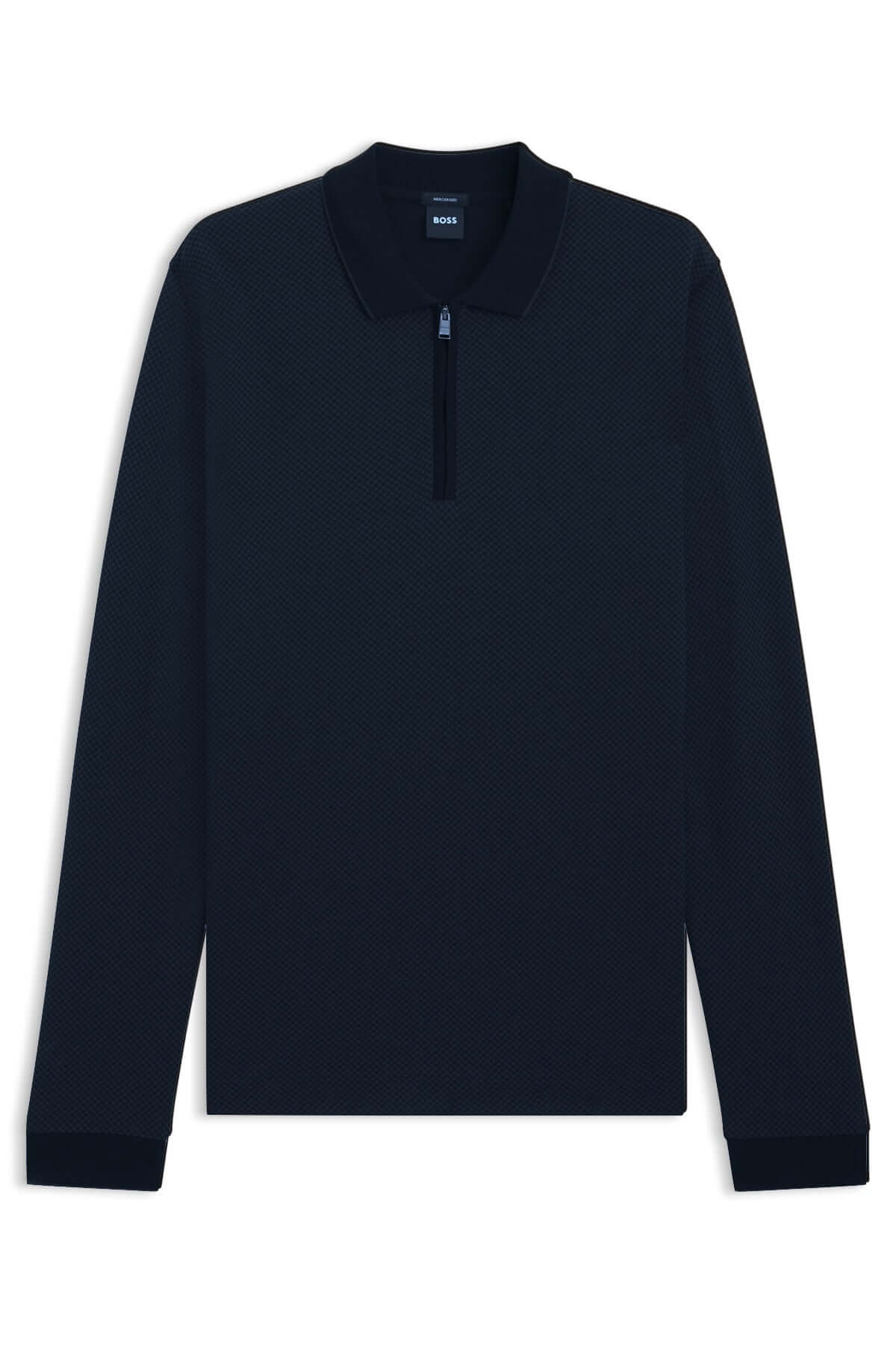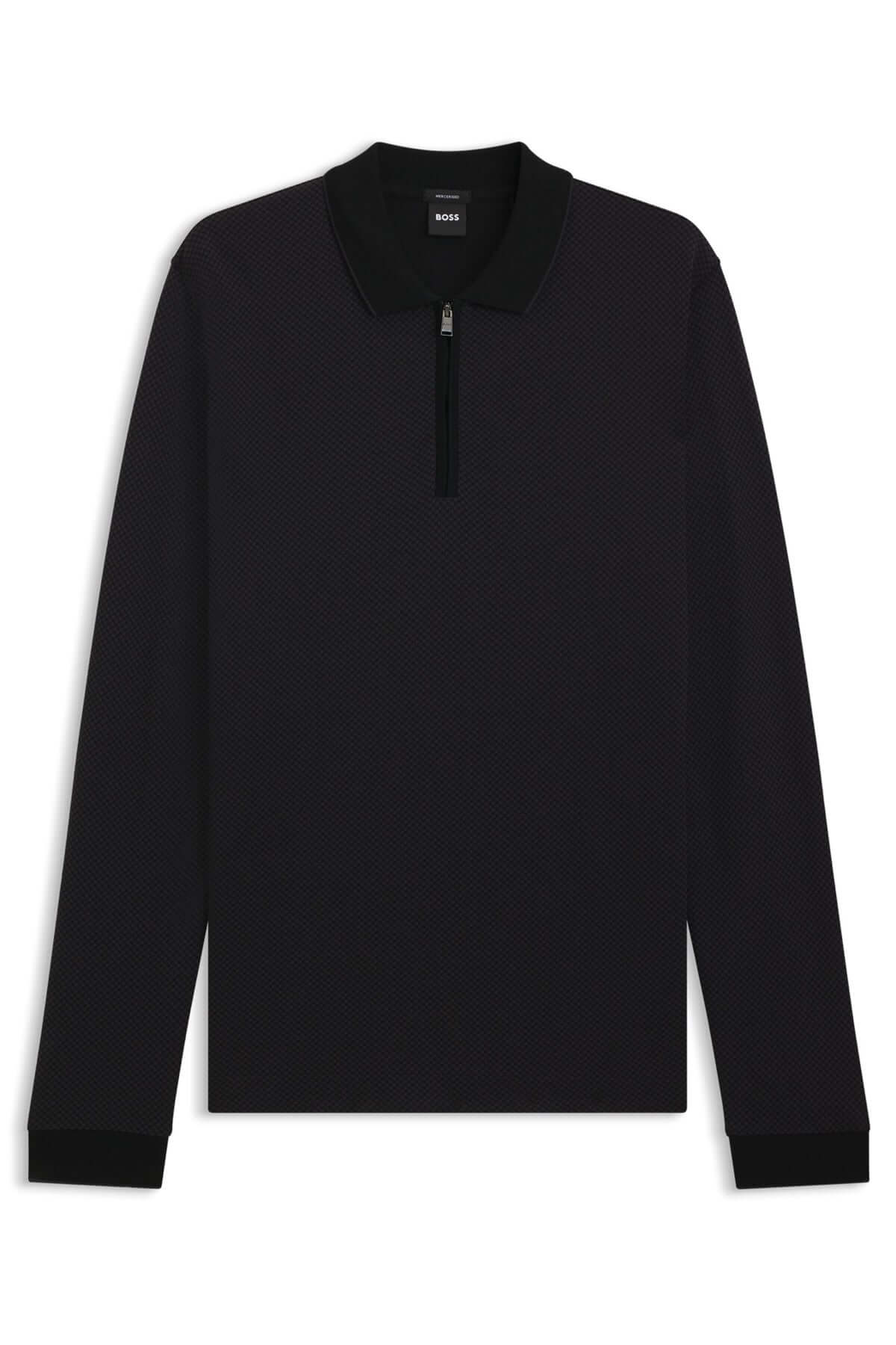 Polo à manches longues avec fermeture éclair en tissu texturé, col contrastant, idéal pour un look raffiné et décontracté.