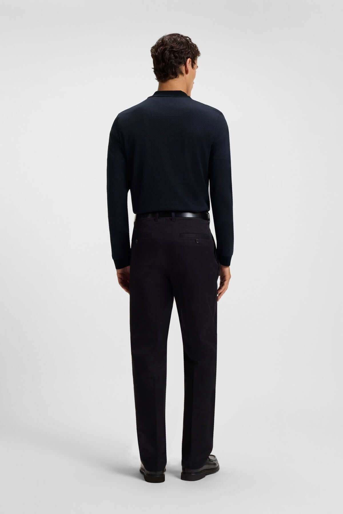 Homme en polo à manches longues avec fermeture éclair, vue de dos, style contemporain, col contrastant, pour un look élégant et décontracté.
