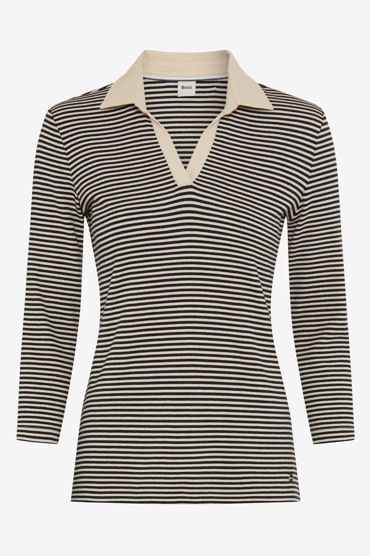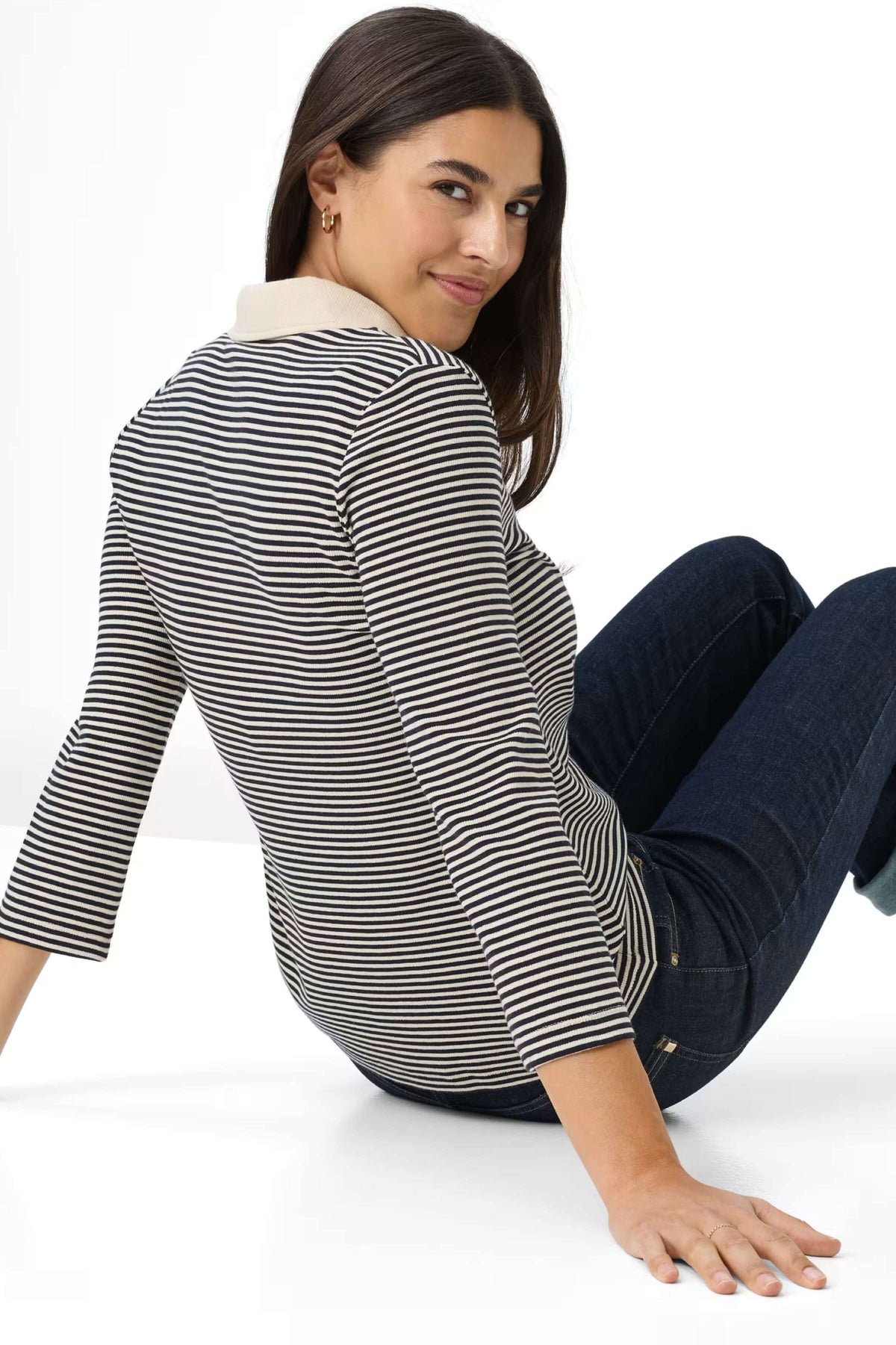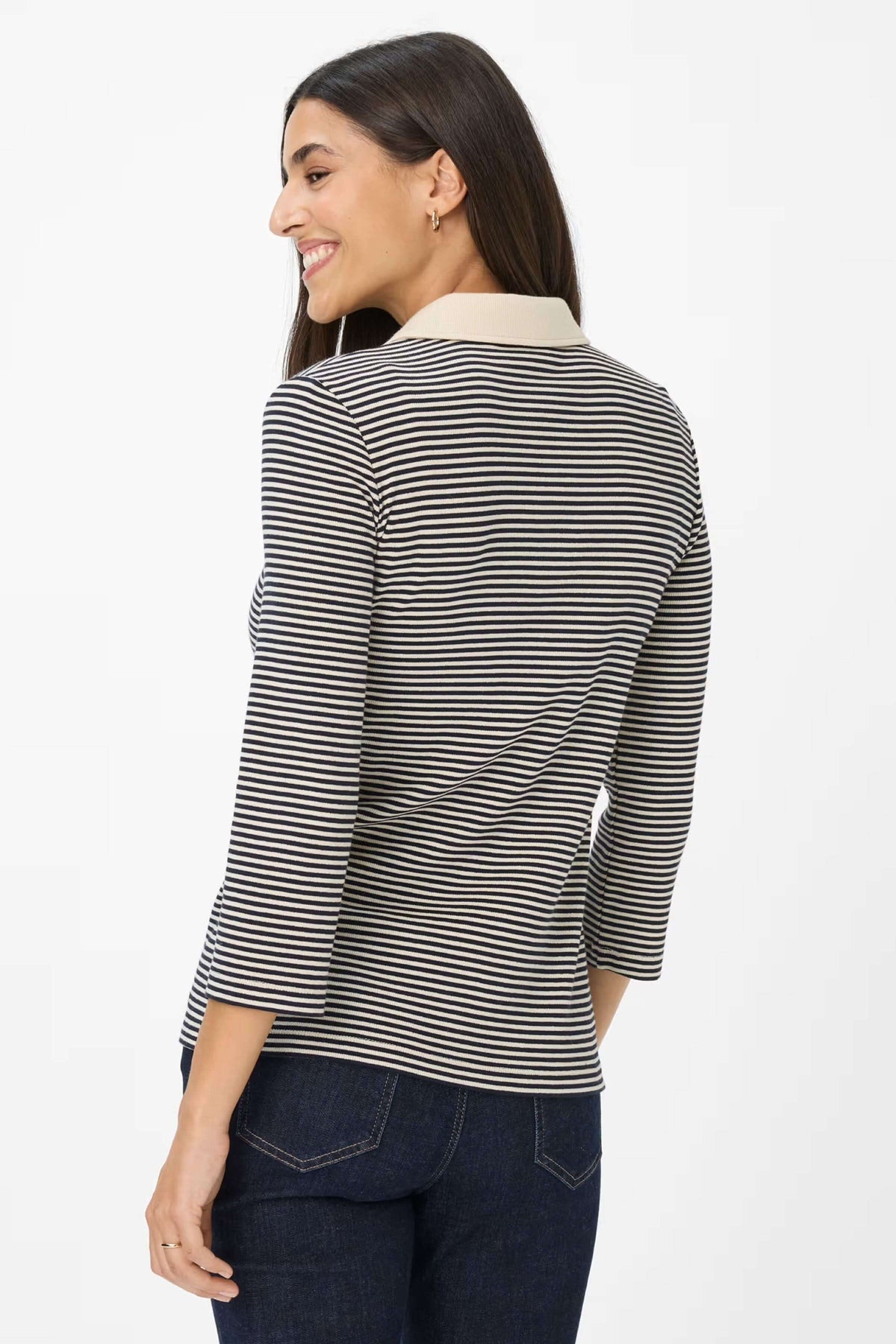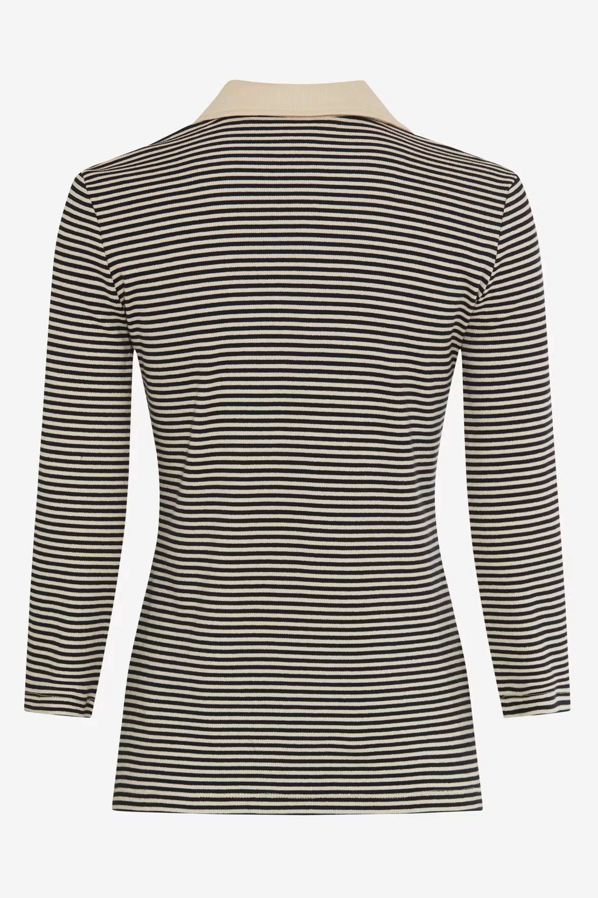 Description: Ce polo à rayures revisite un grand classique avec modernité grâce à son col contrasté et son encolure en V. Sa coupe ajustée et ses manches trois-quarts en font une pièce élégante et confortable. Conseil mode : portez-le avec un jean foncé pour un look casual chic ou glissez-le dans une jupe pour une allure plus féminine.