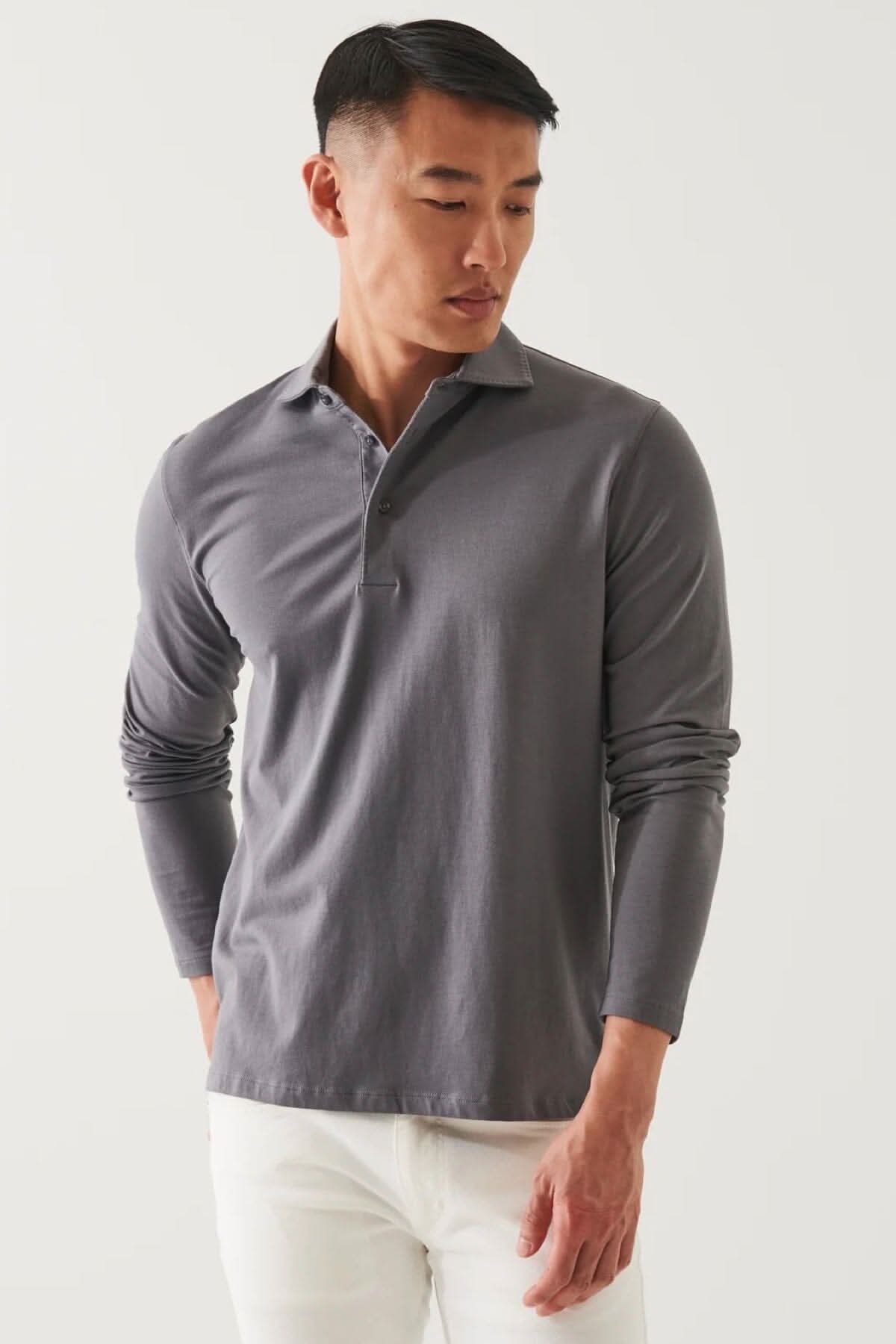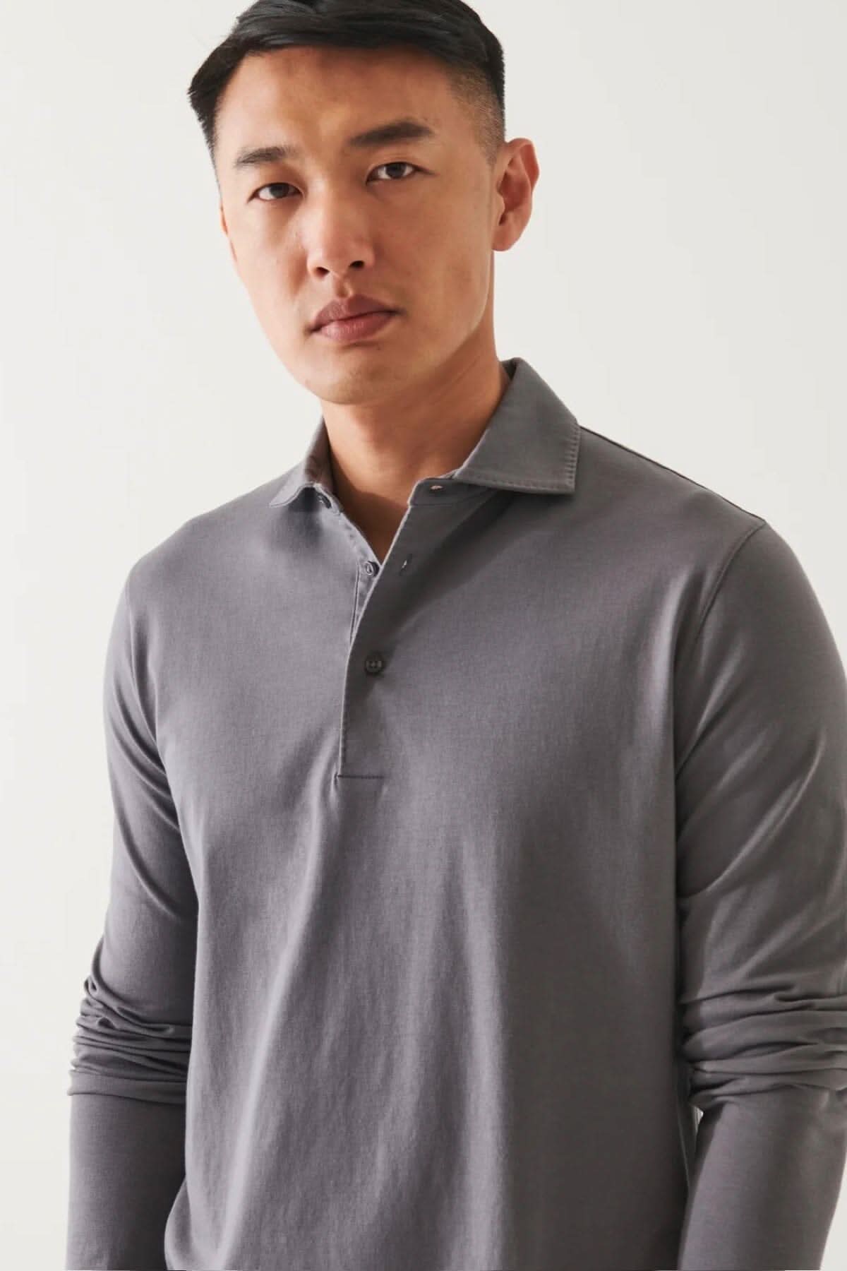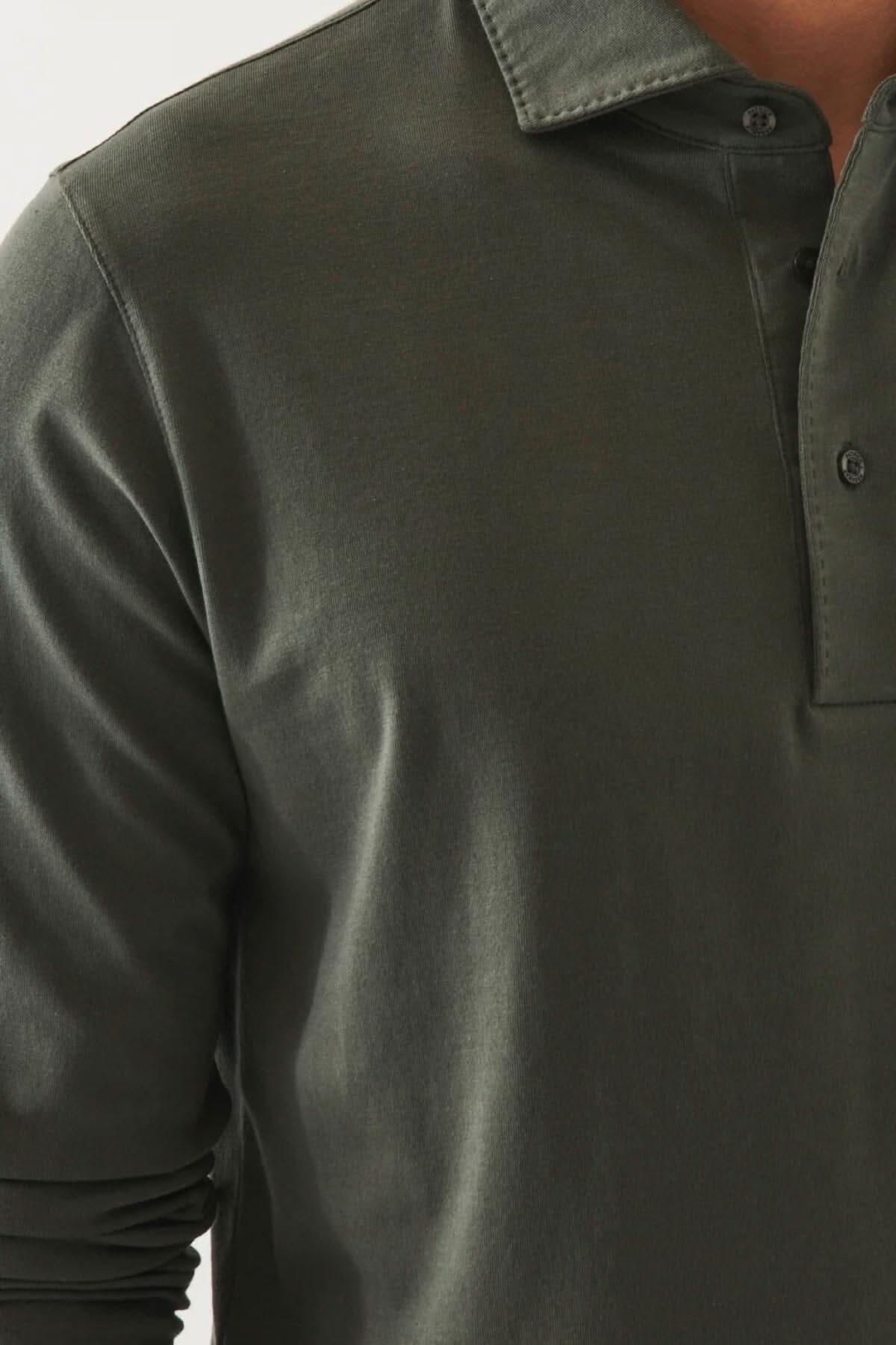 Le polo à manches longues est fabriqué à partir d'un luxueux jersey extensible en coton pima péruvien. Le col est surpiqué pour lui donner un look relevé, lui permettant d'être porté de manière décontractée ou sous un blazer pour une tenue plus ajustée.