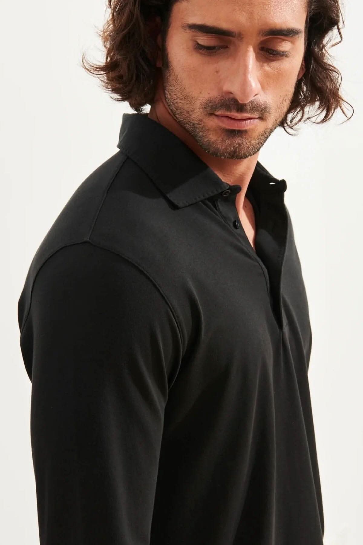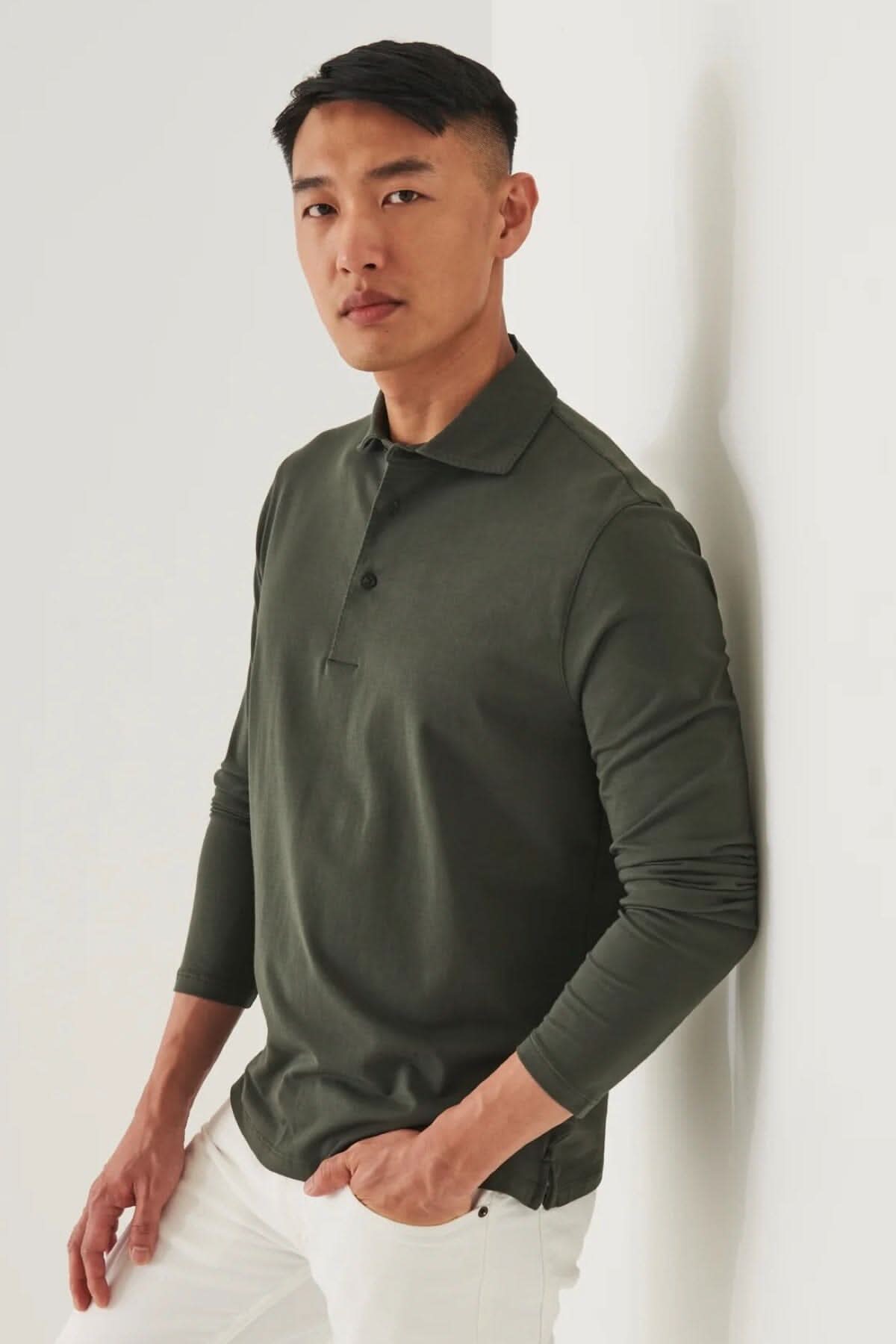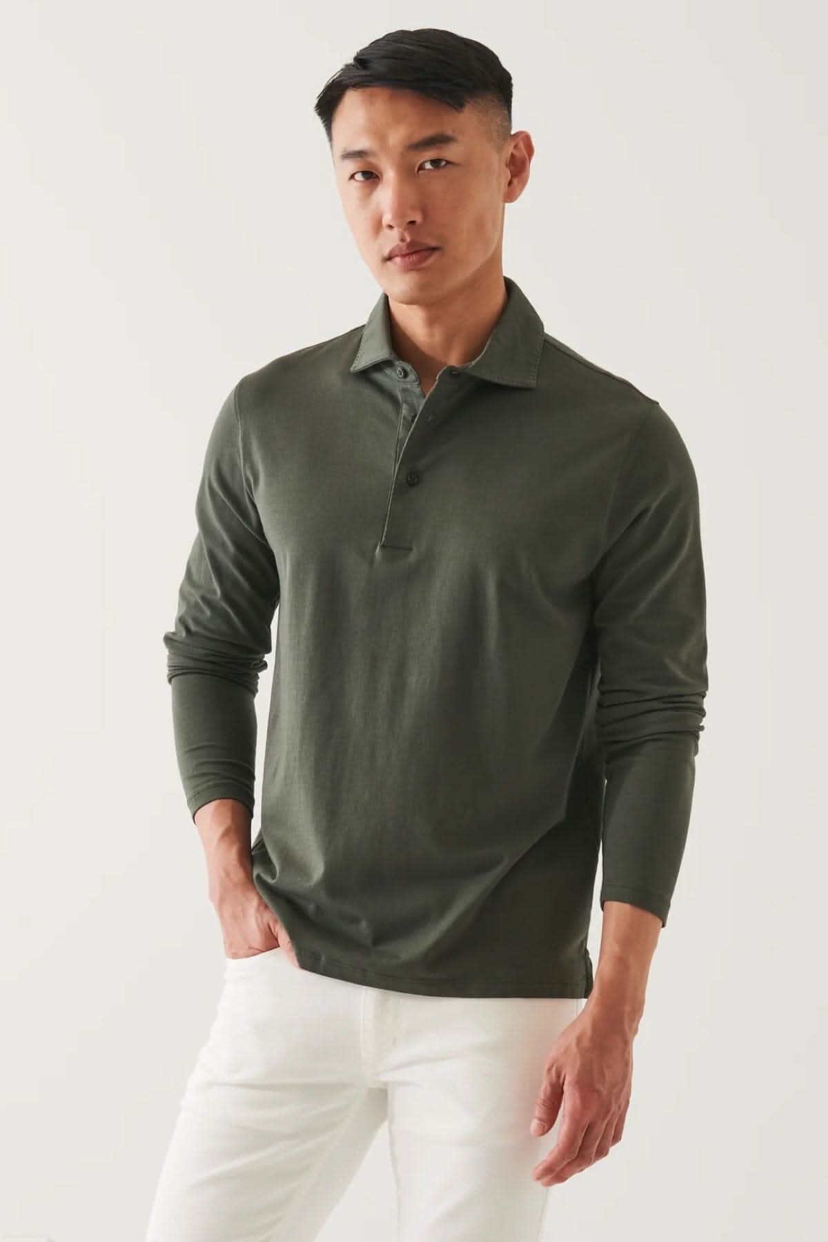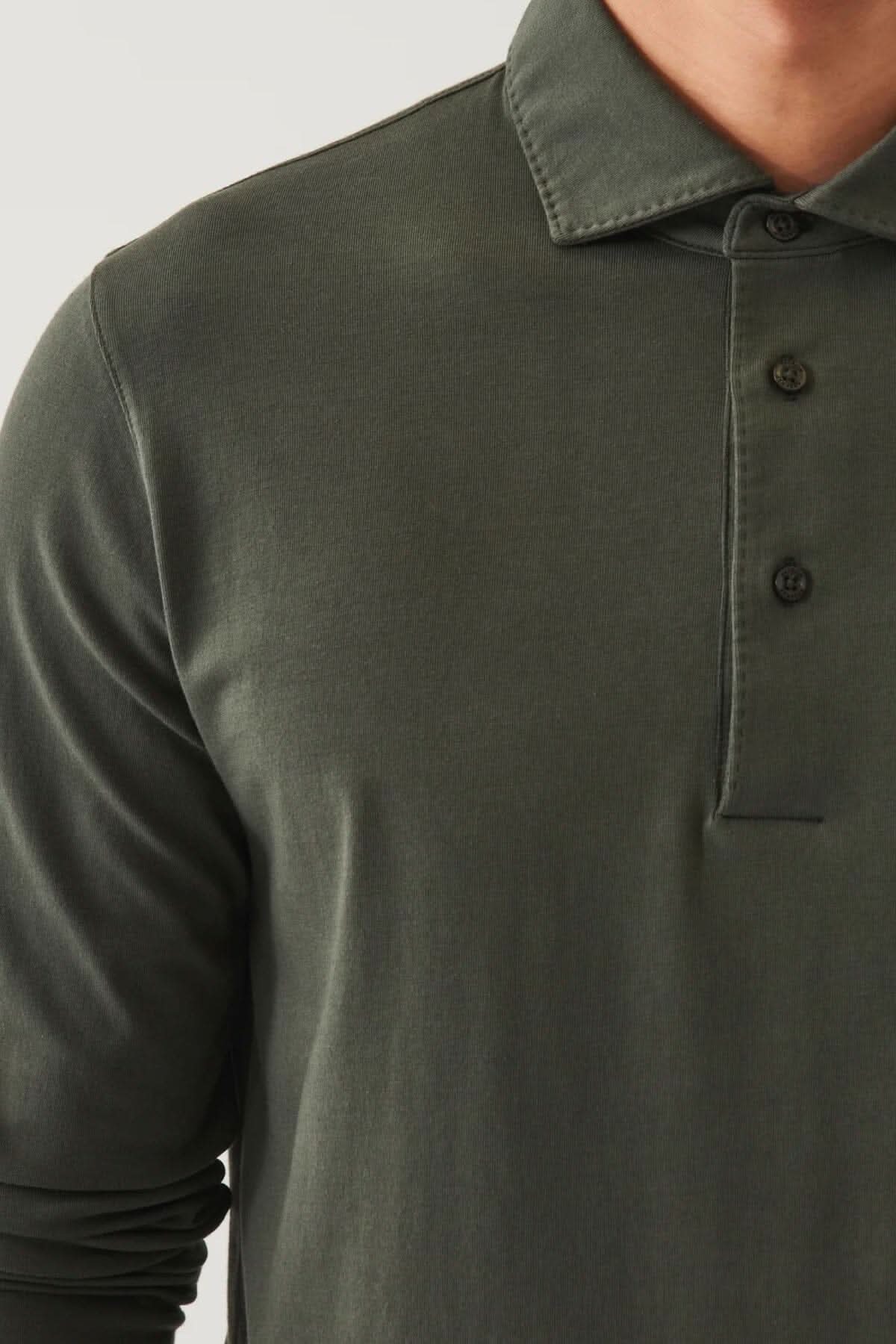 Le polo à manches longues est fabriqué à partir d'un luxueux jersey extensible en coton pima péruvien. Le col est surpiqué pour lui donner un look relevé, lui permettant d'être porté de manière décontractée ou sous un blazer pour une tenue plus ajustée.