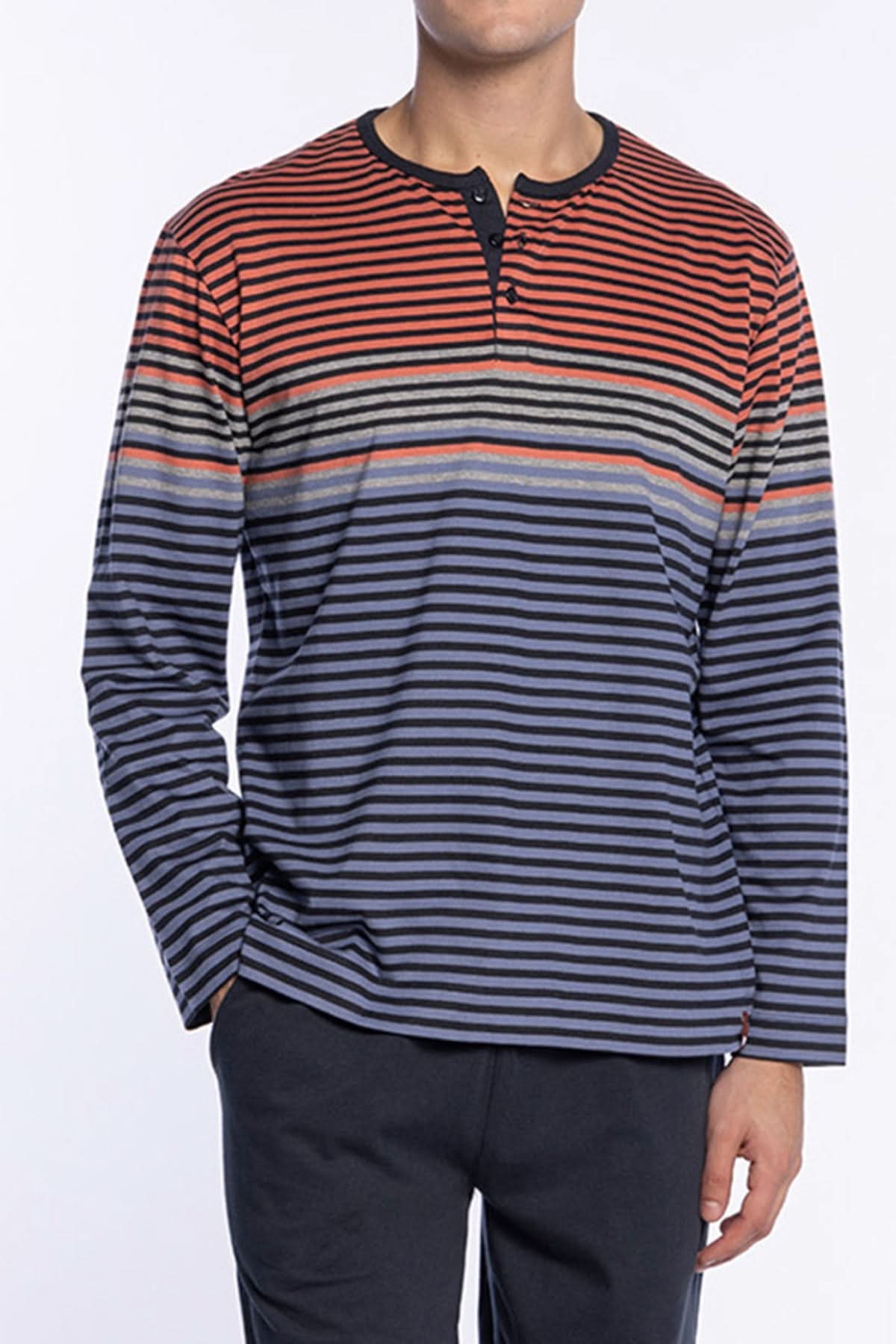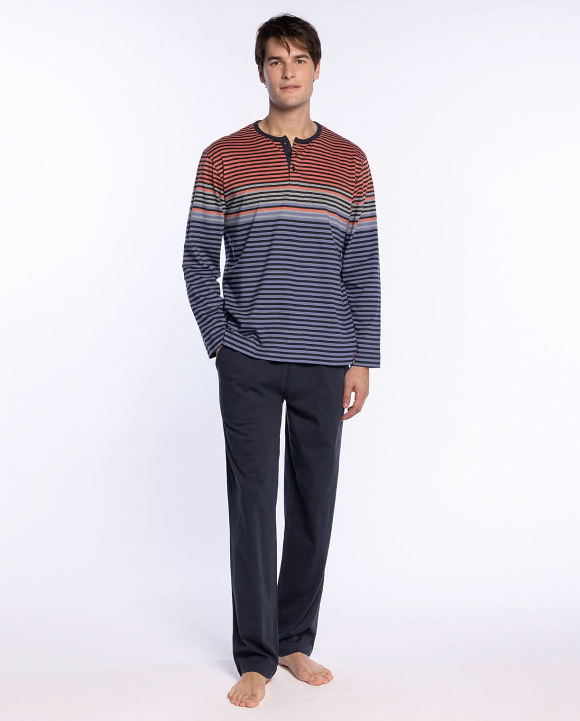 Pyjama long pour homme confectionné en 100 % coton doux, offrant un confort supérieur pour la nuit ou les moments de détente. Le haut à rayures multicolores présente un col rond ouvert avec patte à boutons, tandis que le pantalon uni offre une coupe droite et décontractée. L’ensemble propose une texture agréable, respirante et légère, idéale pour une utilisation quotidienne.