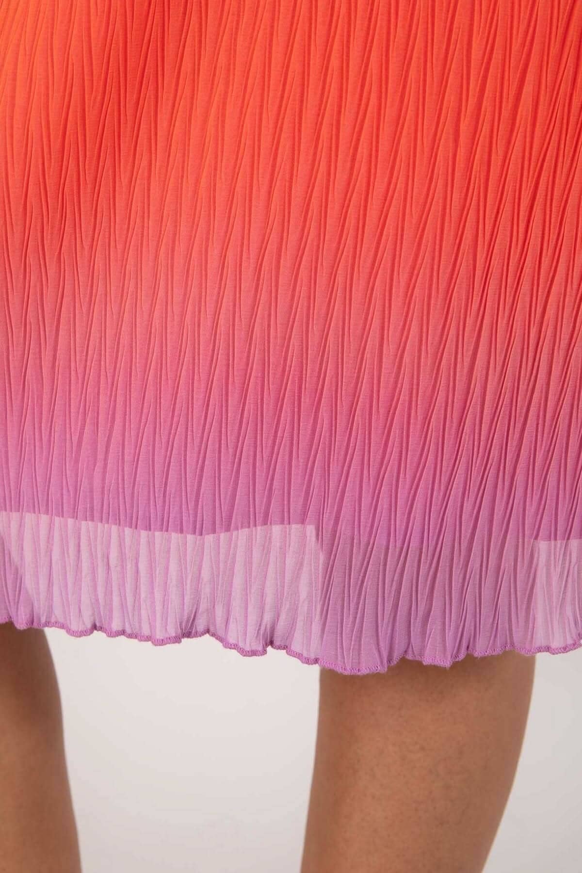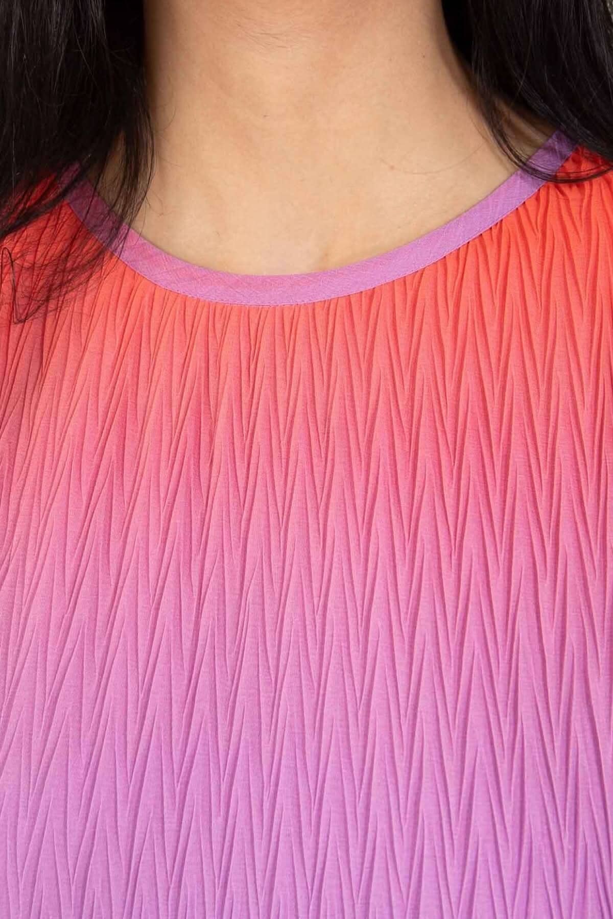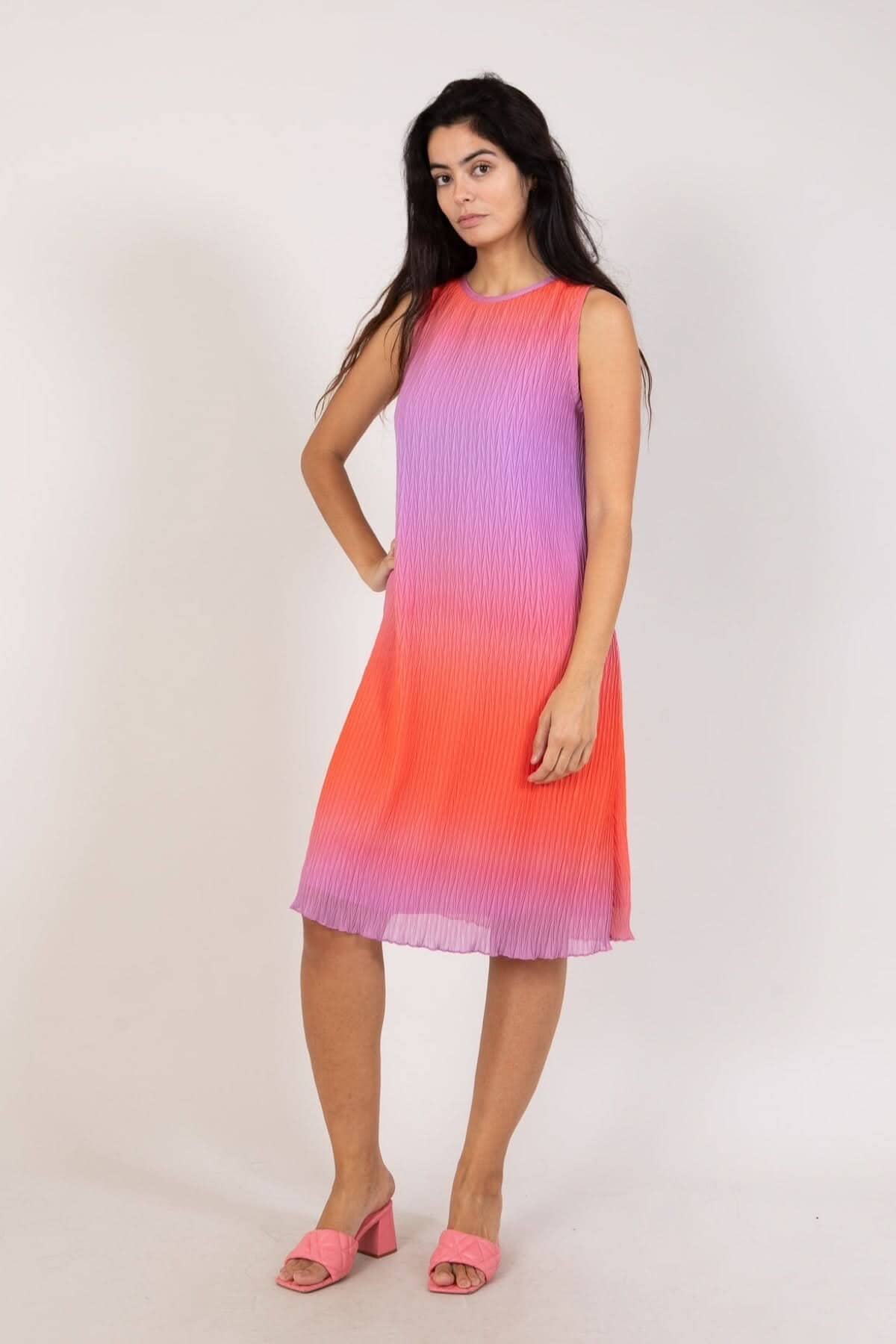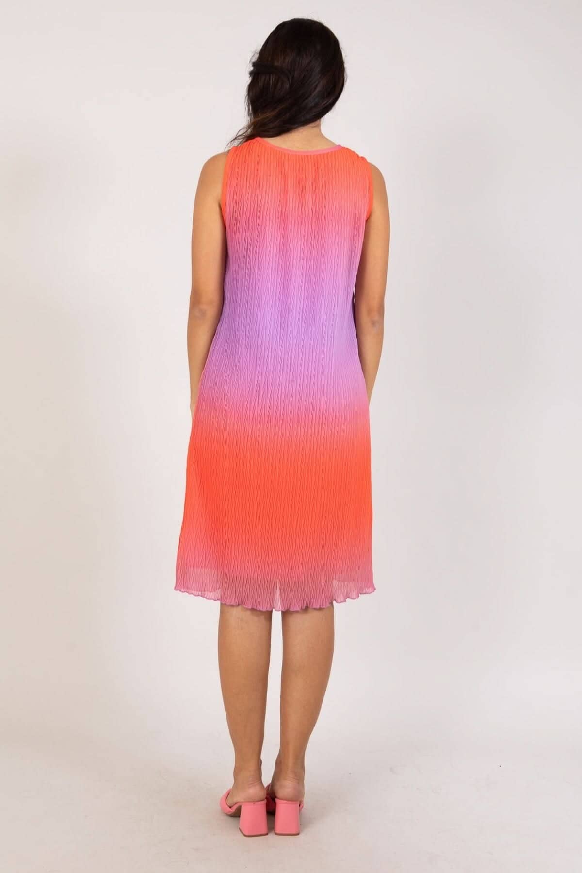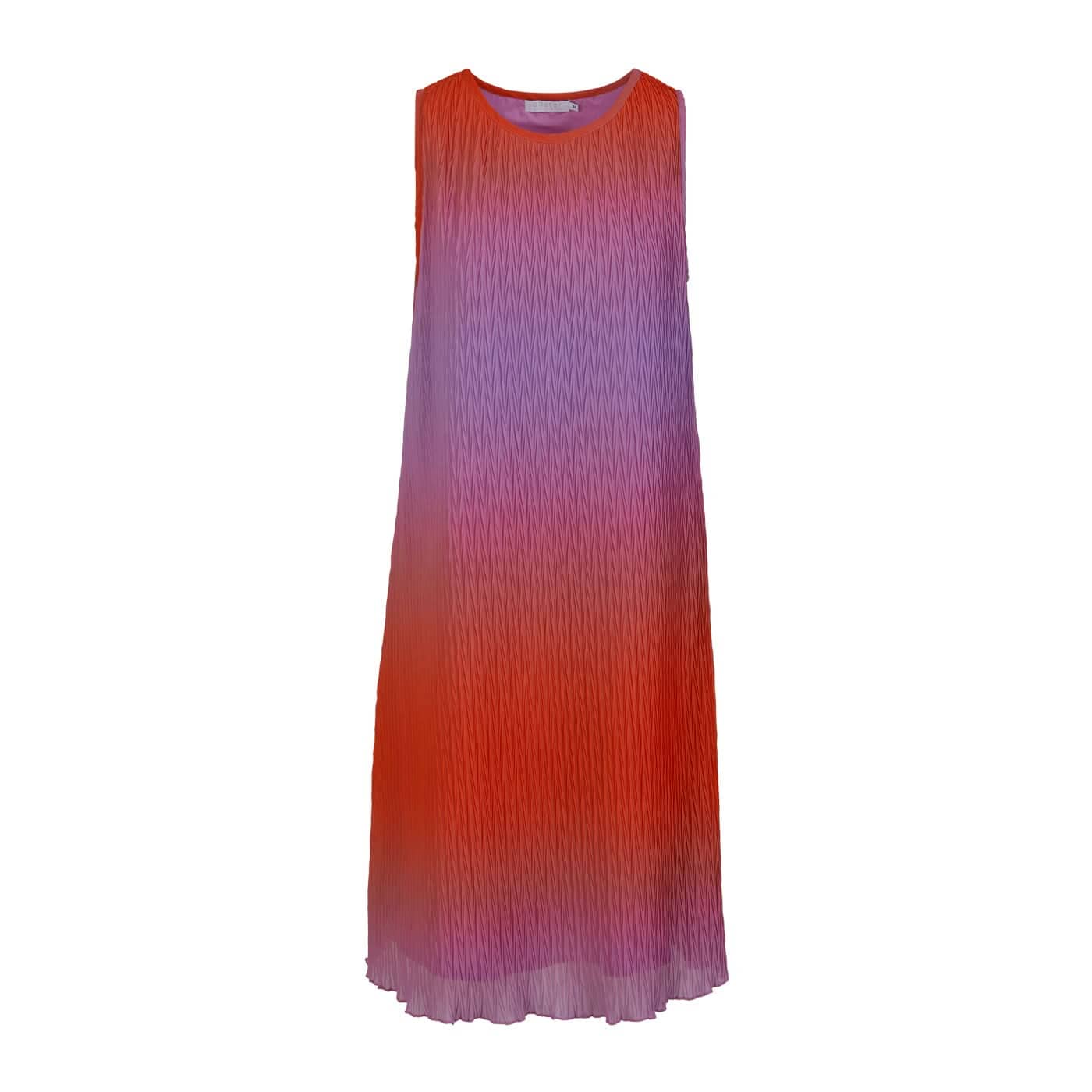 DESCRIPTION: Jolie robe avec dégradé de couleurs. Elle comporte une coupe régulière dans le haut et plus ample dans le bas. Elle a une longueur jusqu'aux mollets, sans manches et encolure ronde.