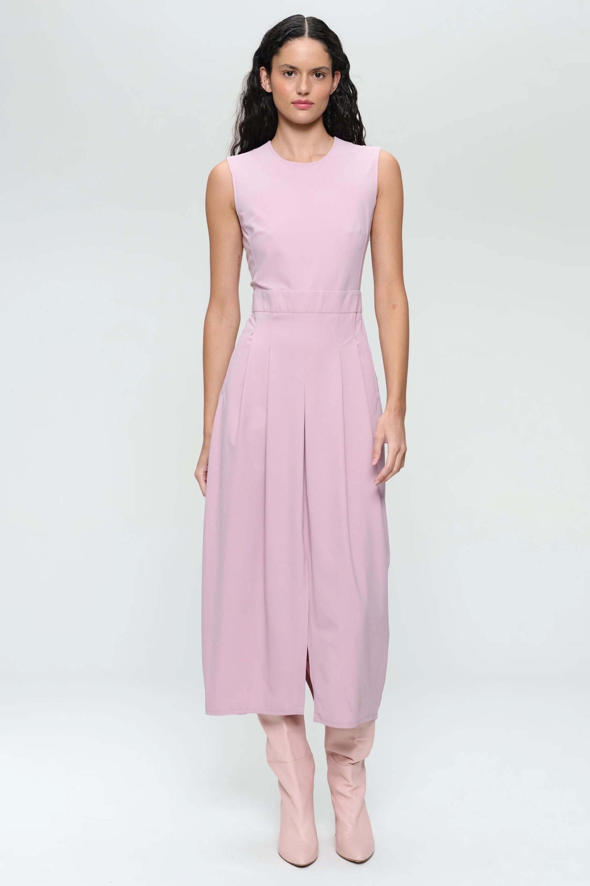 Description : Cette robe midi sans manches séduit par sa coupe structurée et son allure moderne. Son encolure ronde et sa taille cintrée sculptent joliment la silhouette, tandis que les plis creux apportent du volume et du mouvement. Un choix raffiné à porter seul ou superposé à des bottes hautes pour un effet mode assuré.