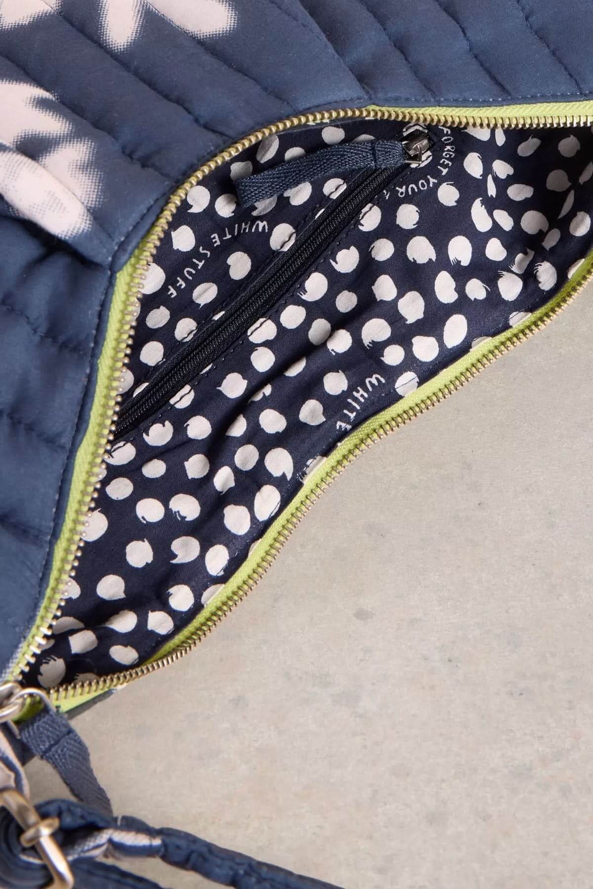 DESCRIPTION: Ce sac bandoulière imprimé apporte une touche artistique unique à vos tenues grâce à son motif réalisé avec une technique innovante de cyanotype. Sa forme moelleuse et décontractée allie style et praticité, parfait pour vos journées actives. Portez-le avec une tenue minimaliste pour mettre en valeur son design ou avec des pièces texturées pour un look audacieux et créatif.