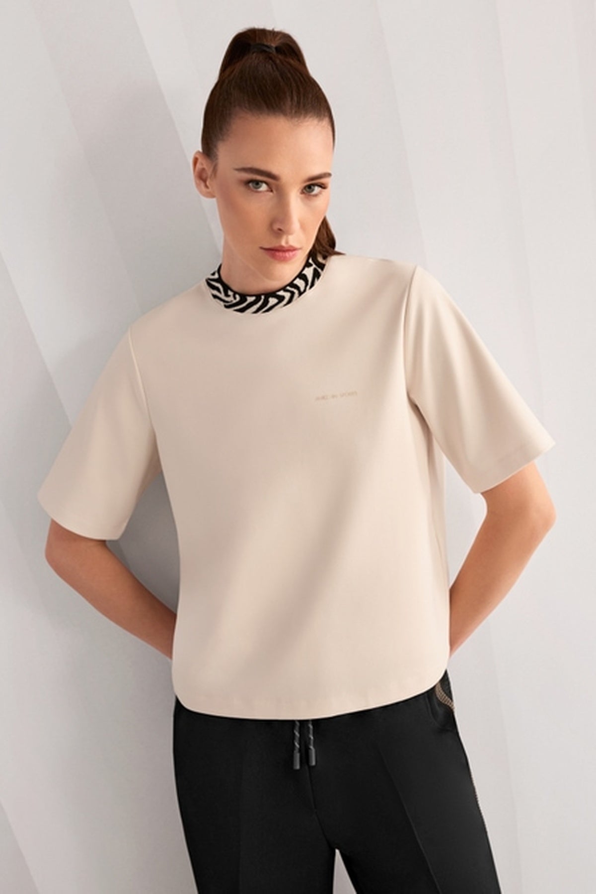 Description : T-shirt décontracté de coupe droite et aux manches légèrement plus longues. Ce t-shirt est confectionné dans un mélange doux de coton, ce qui le rend très agréable à porter. Le col est de couleur contrastée. Un petit logo Marc Cain Sport est apposé sur le devant et dans le bas du dos.