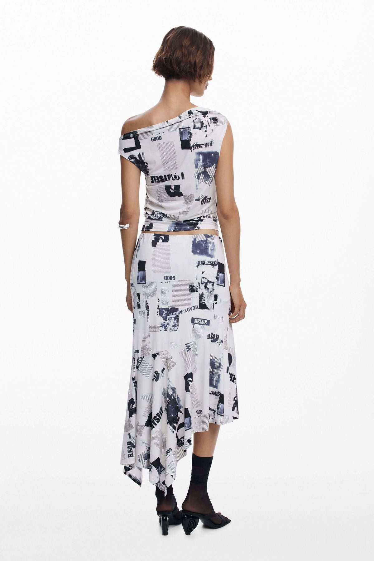 Description : Ce t-shirt asymétrique à col bateau propose un imprimé typographique audacieux et contemporain. Sa coupe près du corps et son effet drapé sur le côté soulignent élégamment la silhouette. Conseil style : portez-le avec une jupe assortie ou un pantalon taille haute pour un look à la fois moderne et assumé.