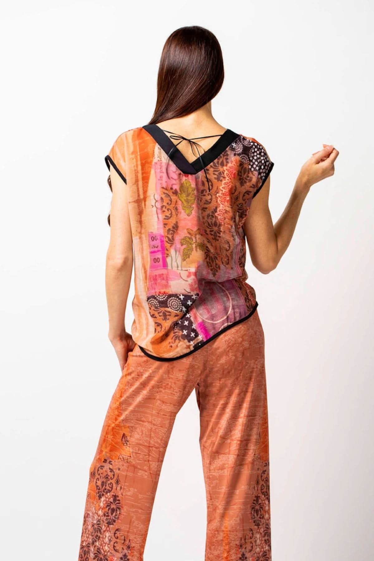 Top imprimé à manches courtes confectionné en chiffon léger et fluide. Conçu pour être porté des deux côtés, il présente une encolure en V de chaque côté, dont l’un est agrémenté de cordons pour une touche d’originalité. Ses finitions au biais ajoutent une touche raffinée. Idéal pour une tenue chic et décontractée, ce haut offre polyvalence et élégance.