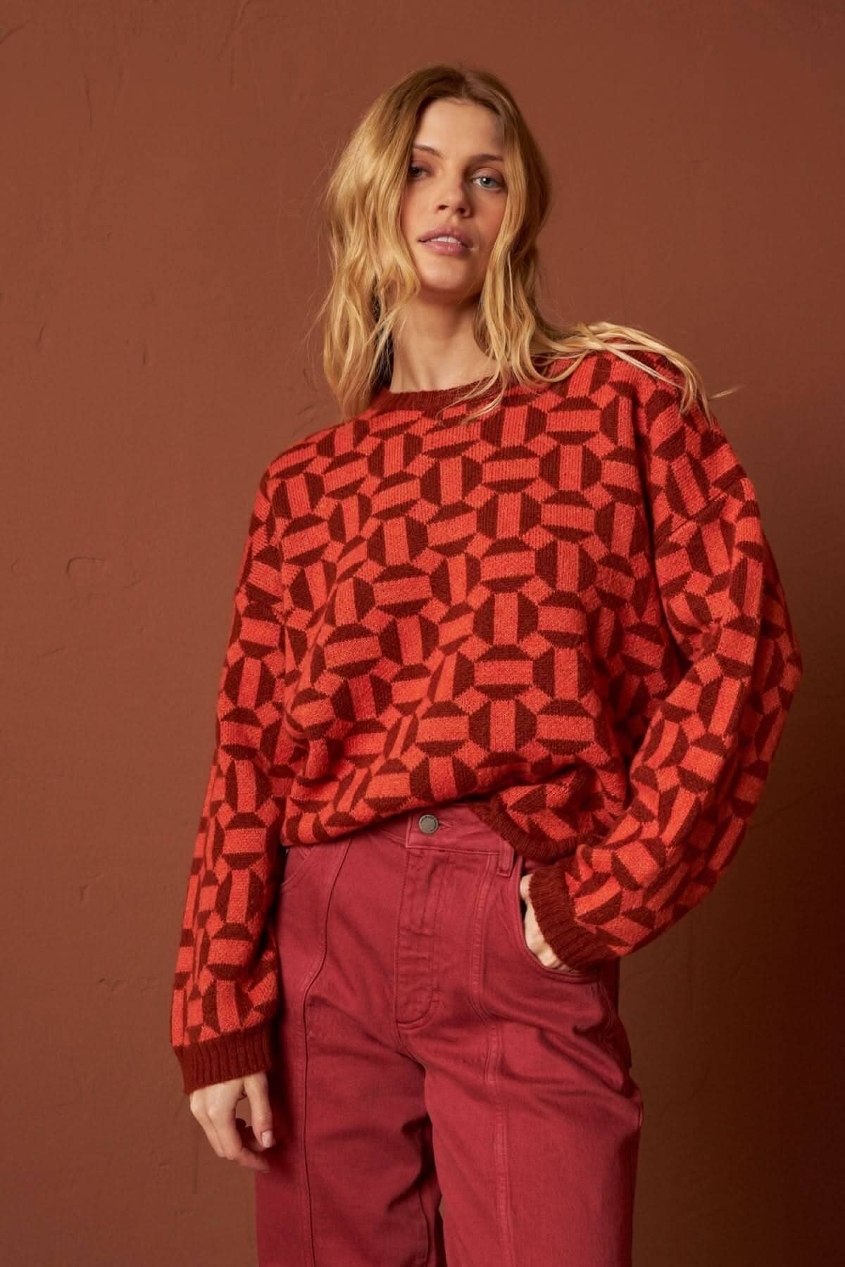 DESCRIPTION: Ce tricot à manches longues se distingue par son imprimé de formes géométriques et sa coupe ample, offrant un confort stylé et une allure originale. Son motif audacieux et unique apporte une touche moderne à votre tenue. Associez-le avec un pantalon slim pour équilibrer la silhouette ou avec une jupe midi pour un look tendance et sophistiqué.