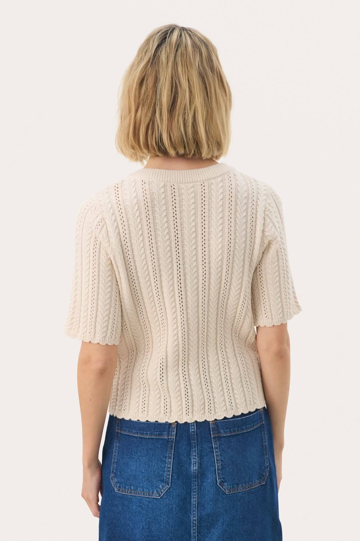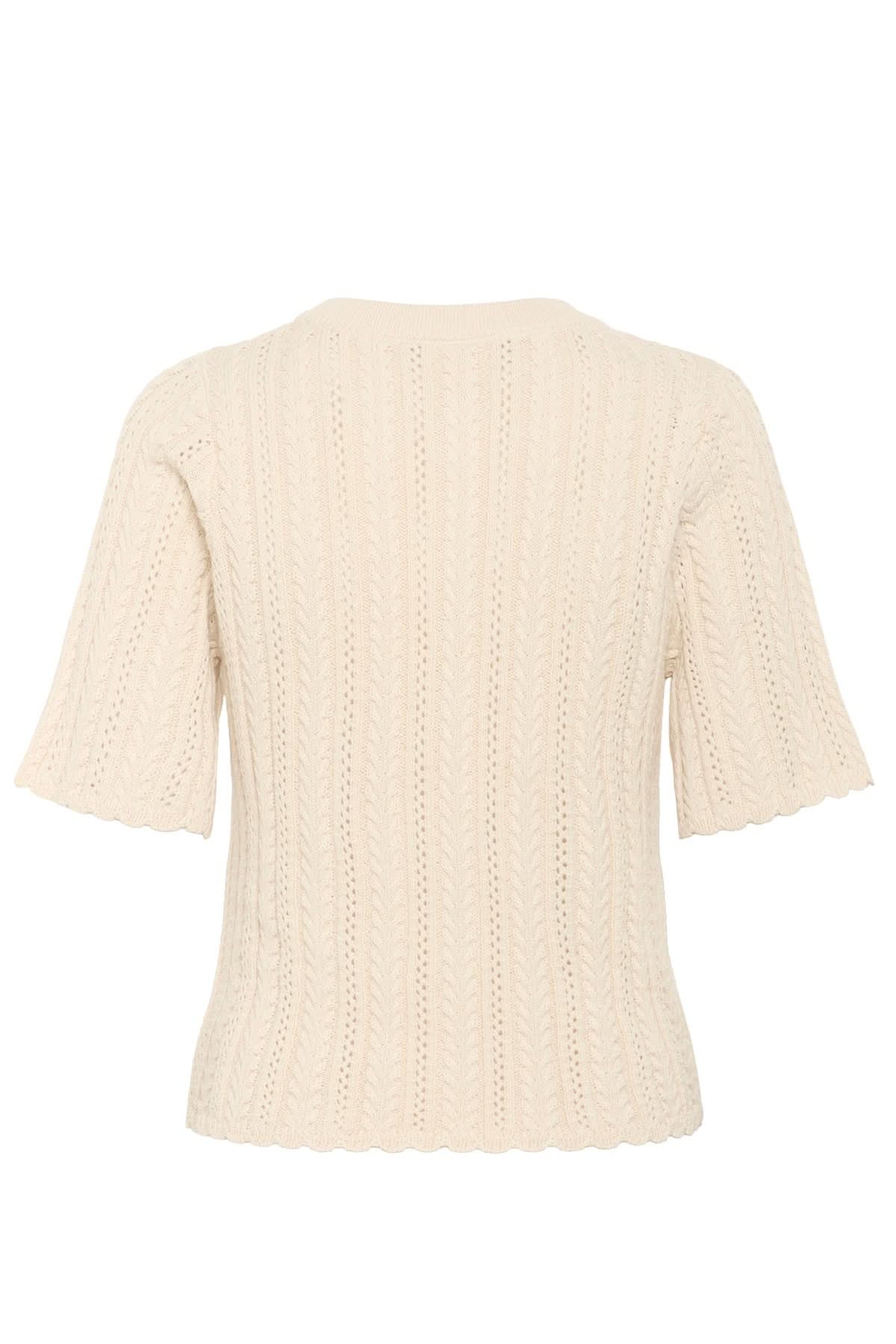 Description : Ce pull en maille crème à manches courtes allie élégance et confort. Il présente un col rond, une patte de boutonnage avec quatre boutons ton sur ton et un délicat motif ajouré et torsadé qui apporte une touche de féminité et de raffinement. Sa coupe droite et sa texture douce en font une pièce facile à porter au quotidien.