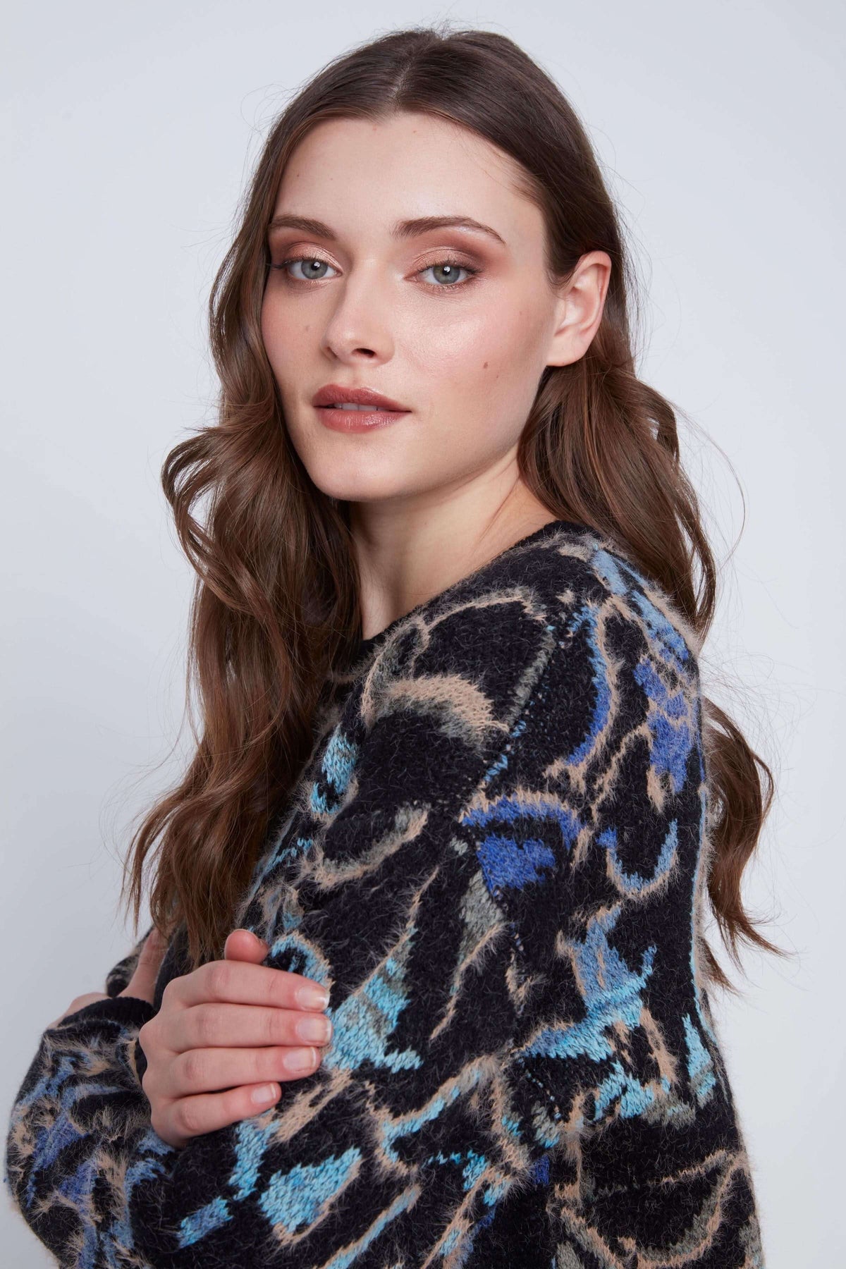 Description: Ce tricot à manches longues arbore un motif abstrait intégral qui apporte une touche artistique et moderne. Sa coupe droite et sa texture douce offrent un confort optimal, tandis que les finitions côtelées au col, aux poignets et à l’ourlet ajoutent de la structure. Conseil style : portez-le avec un pantalon uni ou un jean pour mettre en valeur son motif original.