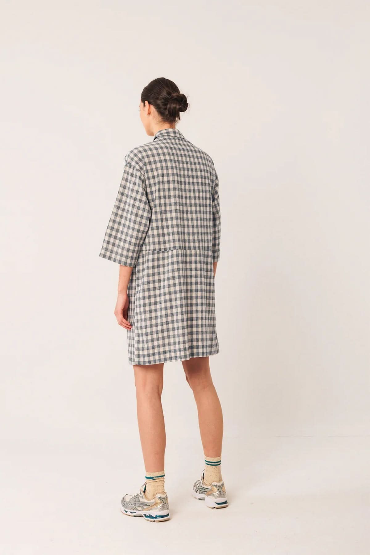 Tunique Vichy à carreaux avec col chemise et manches trois-quarts, idéale pour un look décontracté.