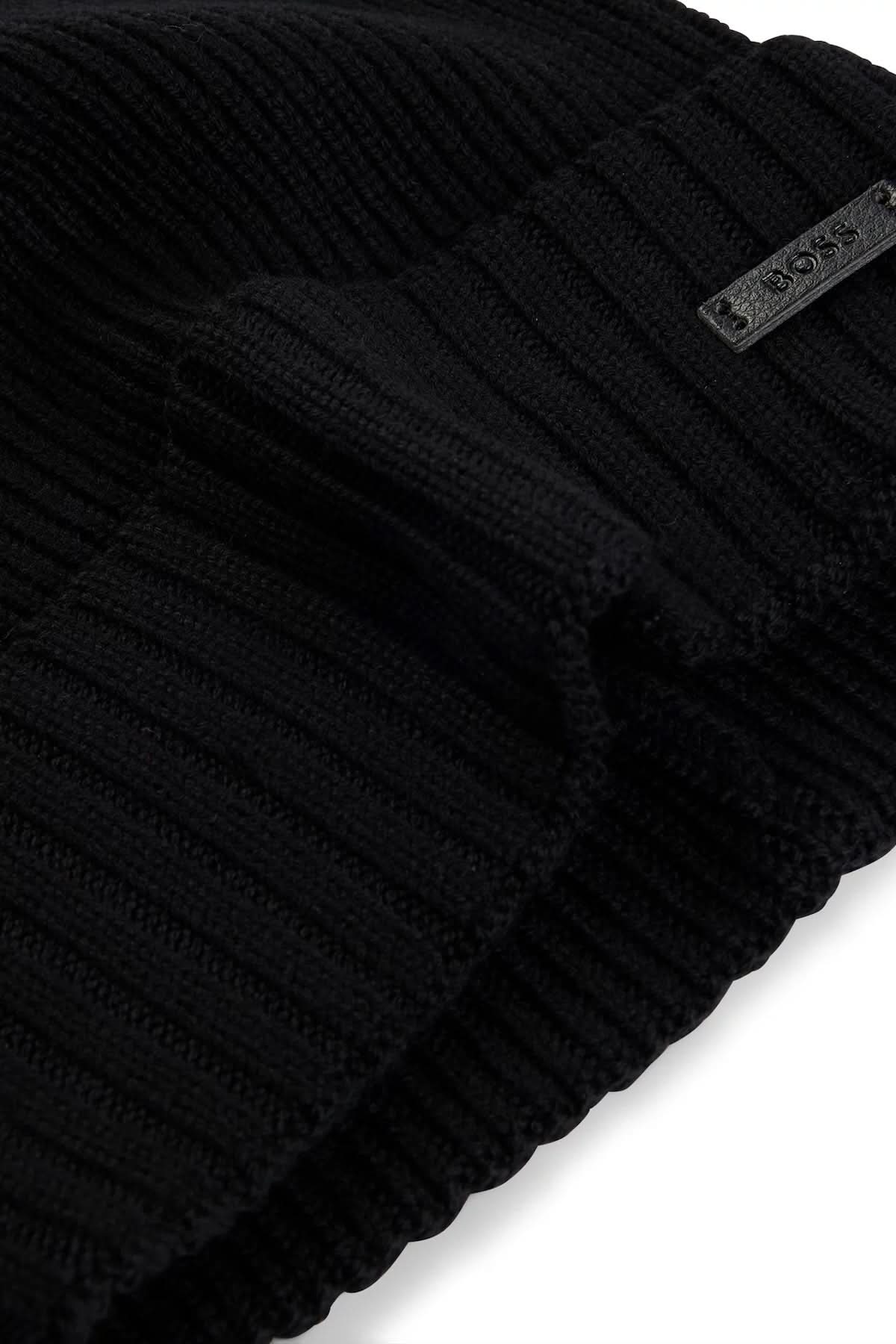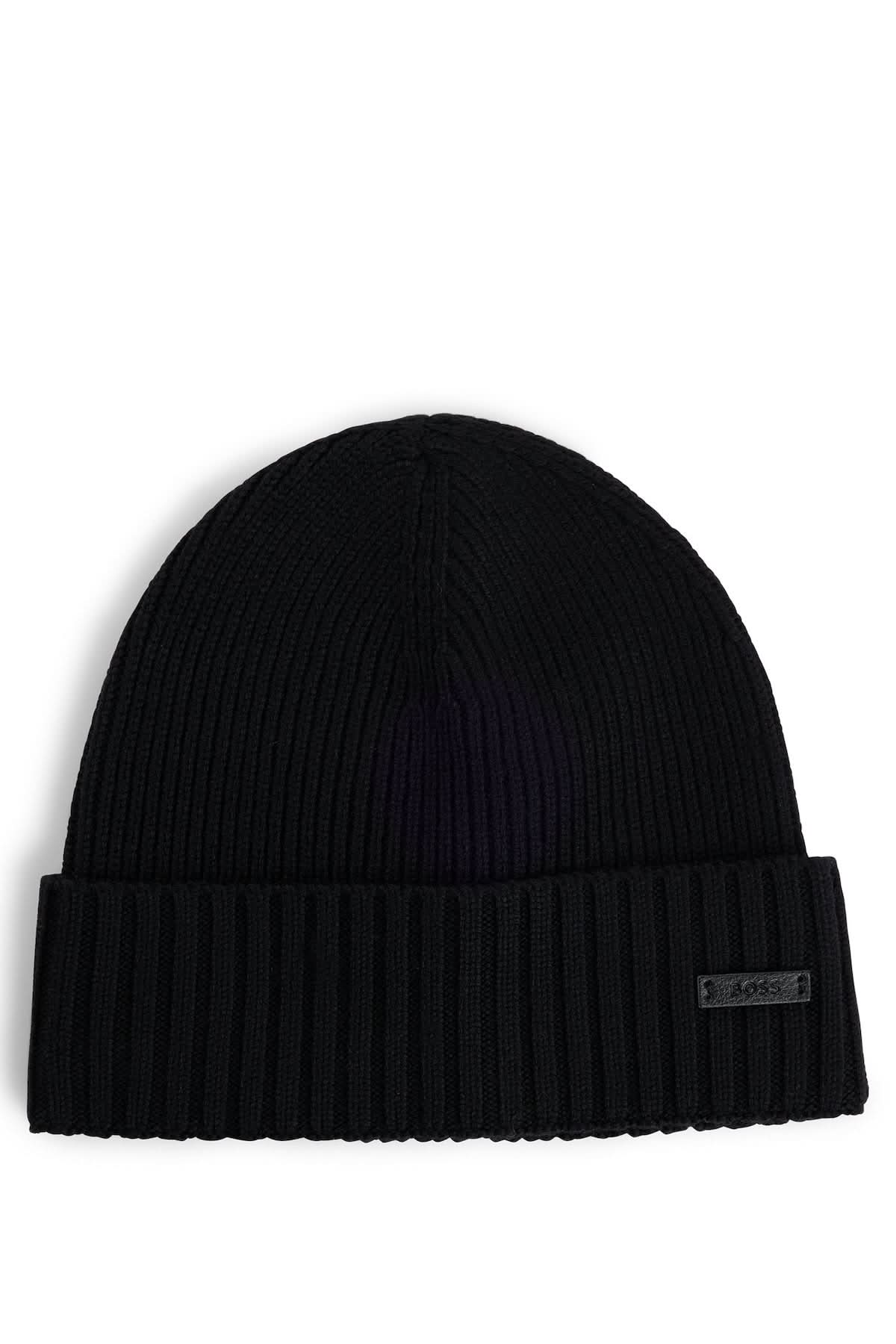 Bonnet douillet avec étiquette logo en tissu synthétique enduit de BOSS. Cet accessoire est tricoté avec une structure côtelée en fil doux. Le tissu enduit synthétique, parfois appelé faux cuir, est un tissu conçu pour ressembler à du cuir véritable et/ou présenter un aspect enduit mat, brillant, lisse ou texturé. Ce produit est fabriqué avec de la laine.