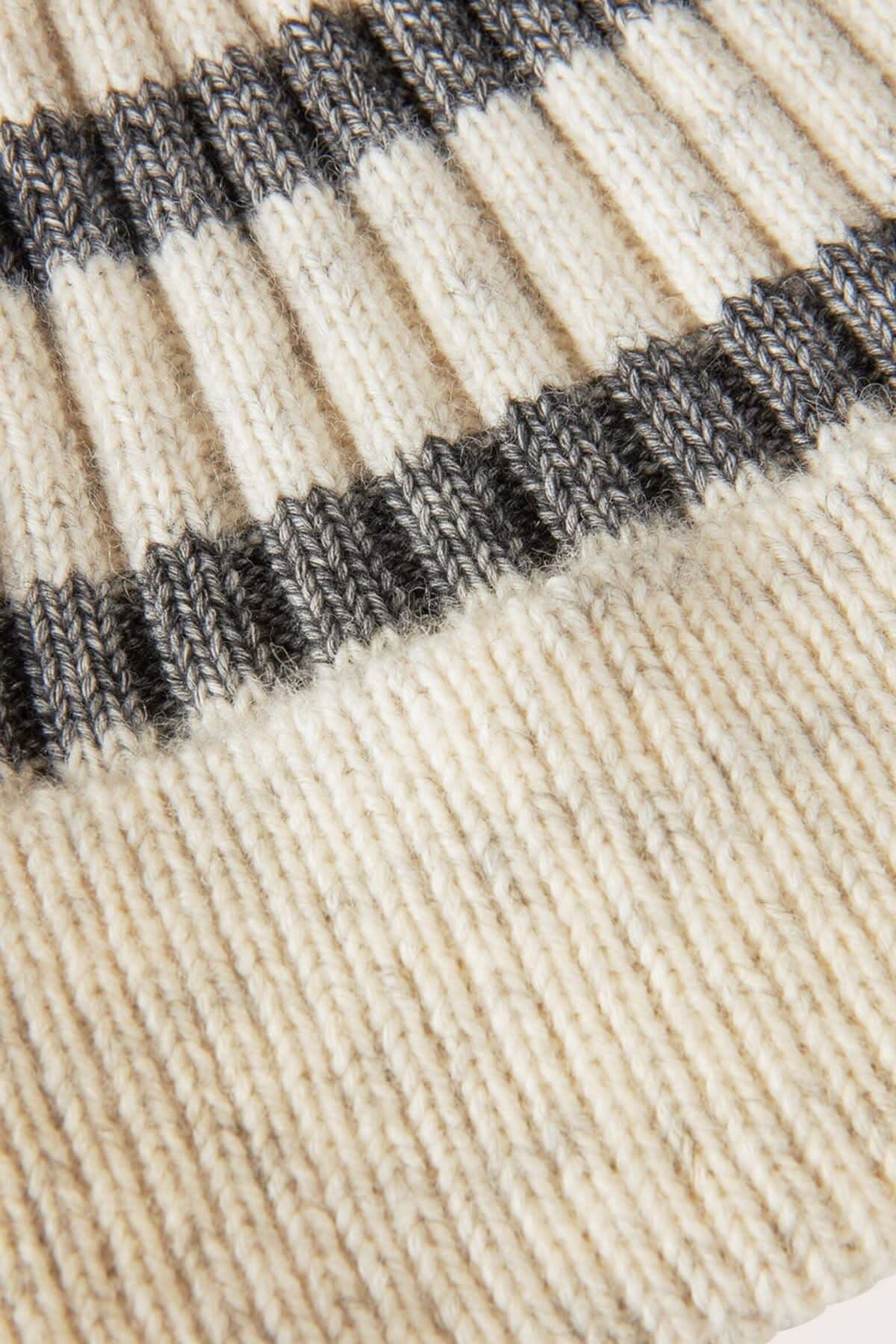 DESCRIPTION: Habillez-vous avec style avec des rayures de la tête aux pieds. Ce bonnet de couleur claire à rayures grises est tricoté dans un tissu résistant en laine et coton qui le rend doux et agréable à porter. Avec sa palette de couleurs neutres, elle s'accorde avec tout.