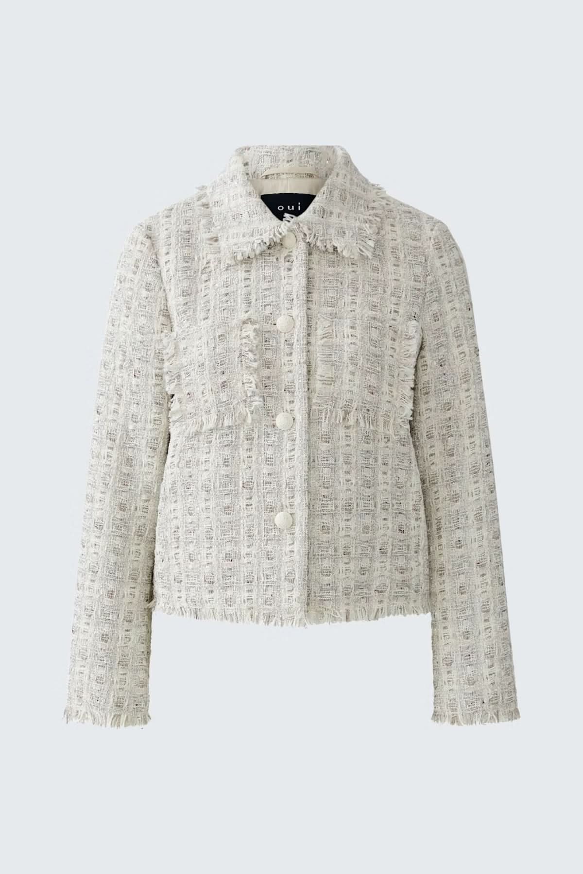 Description: Cette veste en tweed revisite l’élégance classique avec une coupe droite et des finitions effilochées. Ses boutons recouverts et son col chemise apportent une touche chic et intemporelle. Conseil style : portez-la avec un pantalon habillé ou une jupe crayon pour un look sophistiqué.