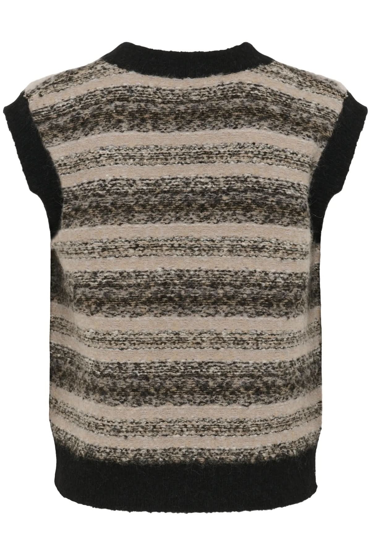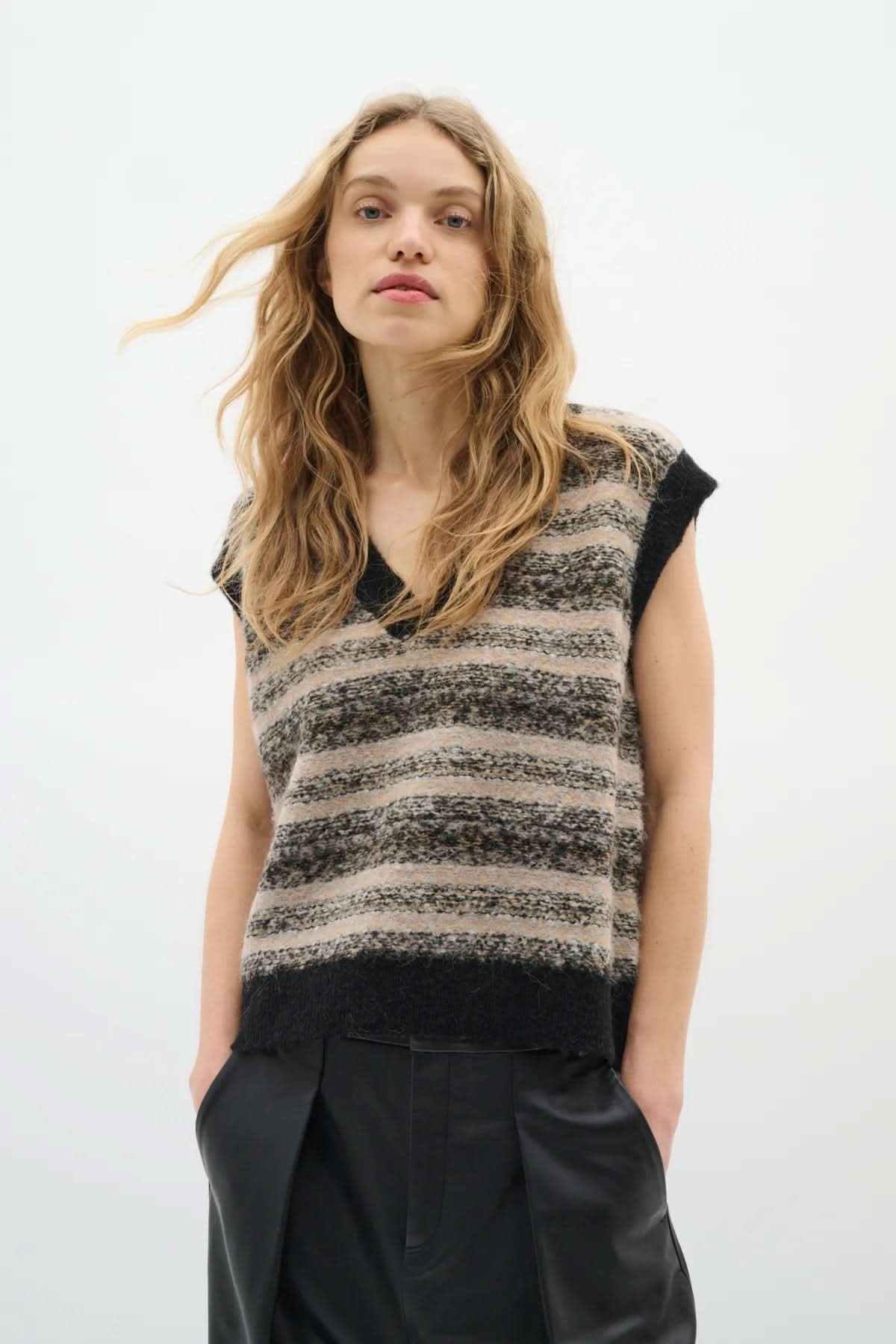 Description : Ce débardeur sans manches mise sur une texture douce et un motif rayé intemporel pour un style à la fois cosy et tendance. Son encolure en V et sa coupe ample offrent une allure décontractée parfaite pour superpositions. Conseil style : portez-le sur une chemise blanche ou un col roulé fin pour une silhouette automnale sophistiquée.